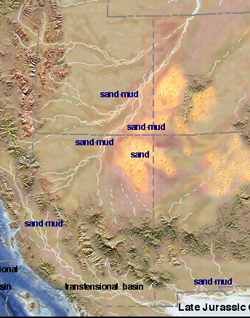 Second, large outcrops of the Morrison Formation are also present here from Hanksville to Notom (the latter is not shown in this map) and down the Waterpocket Fold (as we shall later see). This formation dates from the late Jurassic (155-148 Mya) deposited as alluvial plain, floodplains, river channels, and in hyper-saline lagoons, Some show varicolored mudstone with interbedded sandstone, limestone, and gypsum. The youngest, Brushy Basin Member involved lakes and wetlands. See Jurassic Paleography, Last Map.