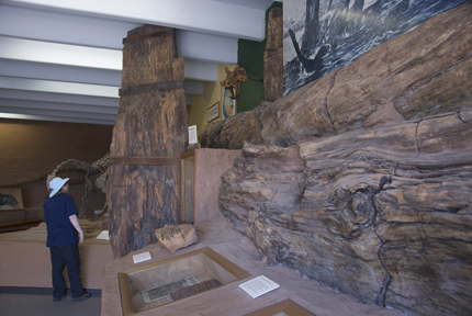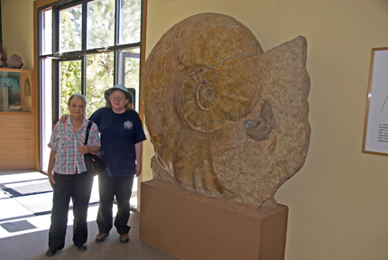 For convenience now, we will start our trip record at Blanding, Utah, a lovely town in the Blanding Basin which boasts two fine museums. Both deserve better publicity than they can afford to attain. First we went to the Dinosaur Museum (see that link), a beautiful place that includes an active research facility. Below left, Judy Warner and Helen stand beside the largest Ammonite fossil I have ever seen, near the entryway. Below right, the Museum's display of petrified wood from early dinosaur times. Click on each image to enlarge it.