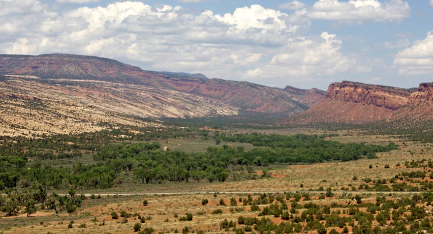 Toward the left portion of the photo above, the erosion power of Comb Wash has exposed a major geological feature of the Monument Monocline: the Permian Cedar Mesa Sandstone, a dominantly white-to-yellow cross-bedded sandstone indicating mainly aeolian origin, but also containing interbeds of red mudstone indicating occasional floods into the dunefield and discontinuous lenses of unfossiliferous gray limestone suggesting beach-and-sandbar conditions.