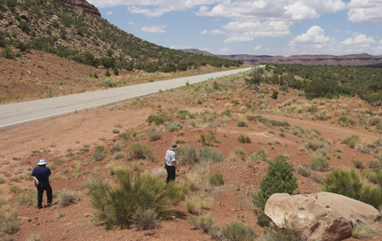 We did stop along the road once, below left, to check out local rocks, and below right to find a place to pee (and walk in beauty....) Click on each image to enlarge it.