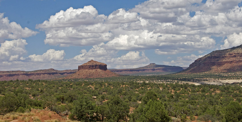 Finally, looking northwestward from a higher viewpoint, beyond the red rocks in the middle foreground we see below a massive, high sequence, with sloping siltstone and mudstone of the Moenkopi Formation and Chinle (Permian) formations, above which appear members of the Glen Canyon Group: vertical cliffs of the Wingate Formation and Kayenta Formation, topped by the massive, light-colored, rounded fins of Navajo Sandstone, a vertical series with the younger but very hard Formation at the top. We have reached the western end of the Monument Uplift, where the younger formations we last saw approaching Comb Ridge reappear as an escarpment.