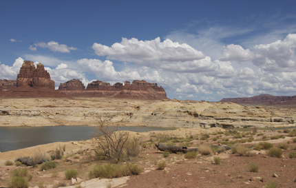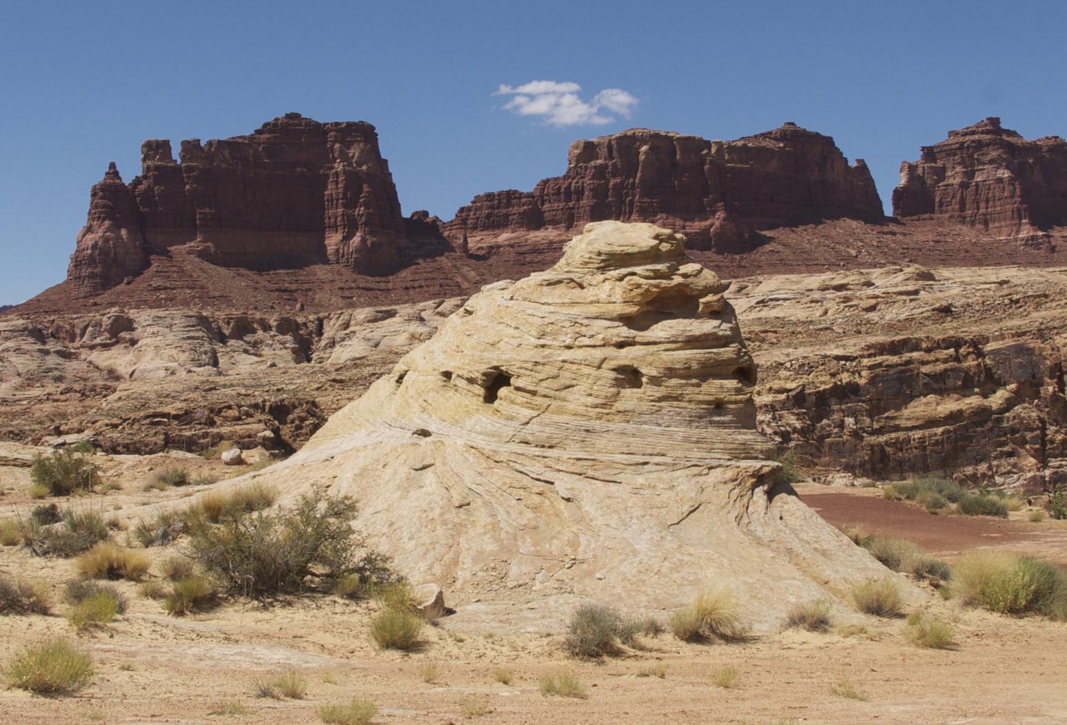 As 95 continues downslope on the Cedar Mesa Sandstone, it reaches the vicinity of the man-made Lake Powell, along the gently declining western flank of the Monument Upwarp. Here we will see again the well-named "Glen Canyon Group" members that we previously encountered at Comb Ridge, representing the other side of the upwarp, but having been eroded from it long ago.
