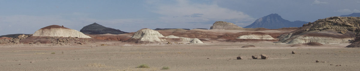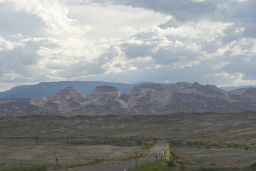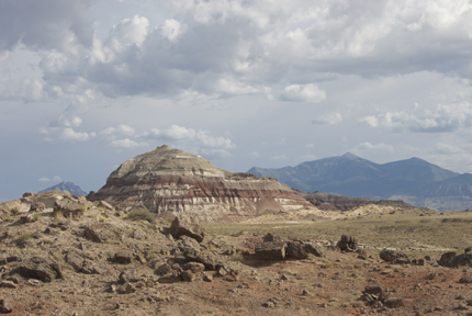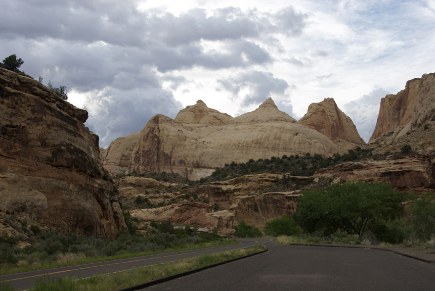 But then we departed this scene in some haste, partly worrying about imminent rainfall prospects (bentonite-laden soils are ill-suited to muddy driving) and partly concerned for our time of arrival at Torrey, where we had a motel reserved.