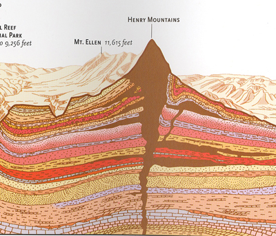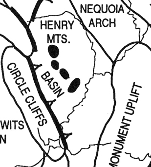 Below left, Barr's Map shows the Henry basin running from the western edge of the Monument Uplift to the edge of Capitol Reef (the here-unnamed mass extending at upper left). The (also unnamed) Colorado River runs down this map detail from upper right to lower left. Below right, this much-exaggerated geological cross-section of the Henry Mountains [adapted from Greer Chesher's Heart of the Desert Wind, 2000, pp. 33-4] illustrates a basis for calling this locale a basin despite how things largely look on the ground (as we shall see in much greater detail later). The underlying sedimentary structures of the area were formerly lower-lying, but the cluster of laccoliths (massive igneous intrusions) shown on map-left distorted them upwards, doming up the overlying Cretaceous structures. Since the intrusions have been dated to 44-21 Mya, they distorted overlying Cenozoic rocks as well. Subsequent erosion has exposed a massive mountain chain. The igneous rocks are gray, diorite porphyry, containing large crystals in a much finer groundmass.