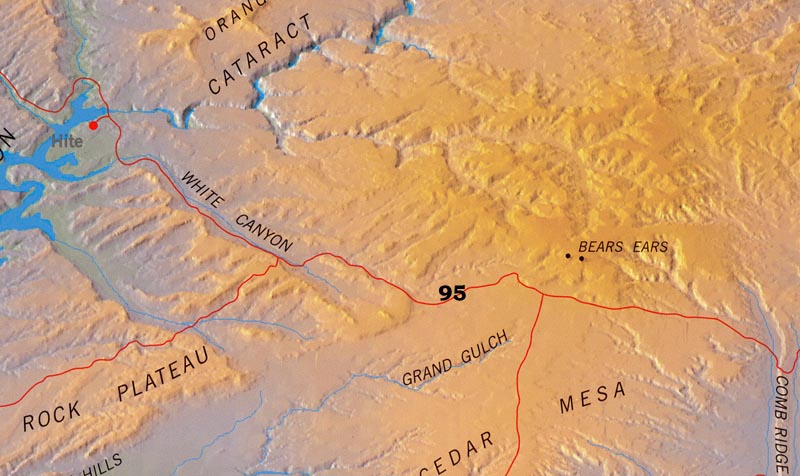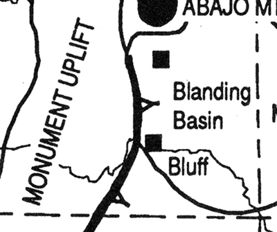 Blanding Basin, which derives its name from the city, is a fairly shallow trough with its boundary at Comb Ridge on the west and at the Red Rock Bench just south of the Arizona border on the south. (We don't deal with it here, though it has deep structural connection with the Paradox Basin, an invisible but economically very important ancient basin that runs north beyond Moab to the Green River area.) In the Blanding Basin we drove west on State Highway 95, heading toward Capitol Reef: