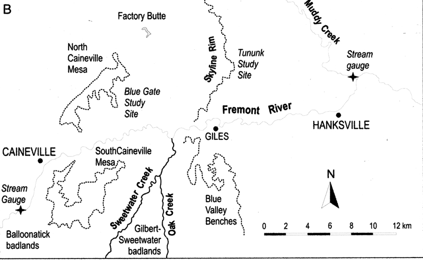 Godfrey et al. worked at a series of sites associated with the Mancos Shale, as shown in the map below. The areas near the Caineville Mesas provide remarkable views of this formation.