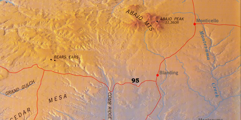 A short distance west from the turnoff on 95 the road rises toward Comb Ridge, which marks the eastern boundary of the Monument Uplift (at left, a detail from Barrs' map, showing the monocline dip at the eastern side).