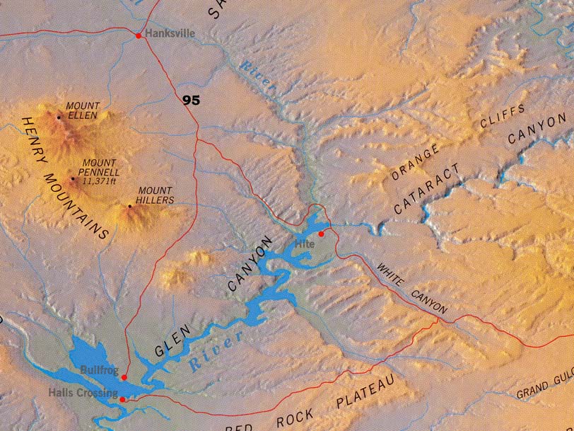 Enroute to our intersection at Hanksville with the route to Capitol Reef, we pass east of these mountains, through what is structurally the Henry Basin. We took no photographs, but memorywise it did not look very basin-like to us, yet clearly it is a serious structural basin, as we will see below.