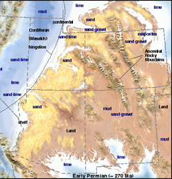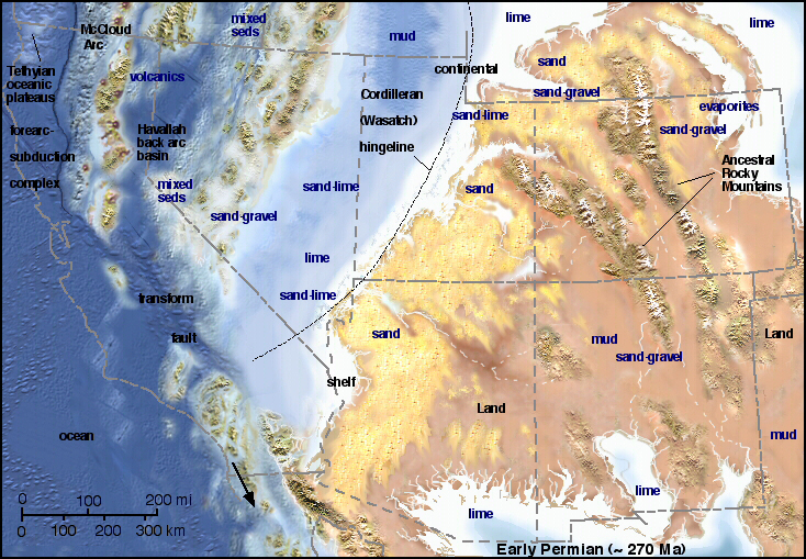 This formation, which is widespread in this area and up to 1,200 feet thick, is named after Cedar Mesa, which forms the broad expanse of the Monument Upwarp surface in this area, running southward all the way to the San Juan River (we will see this again later in the tour). Cedar Mesa Sandstone is the oldest member of the so-called "Cutler Group", Permian Formations of the Paleozoic Era which were laid down from 290-245 Mya. See Blakely et al for its suggested location and time period in the image at left. Click on the image to enlarge it.