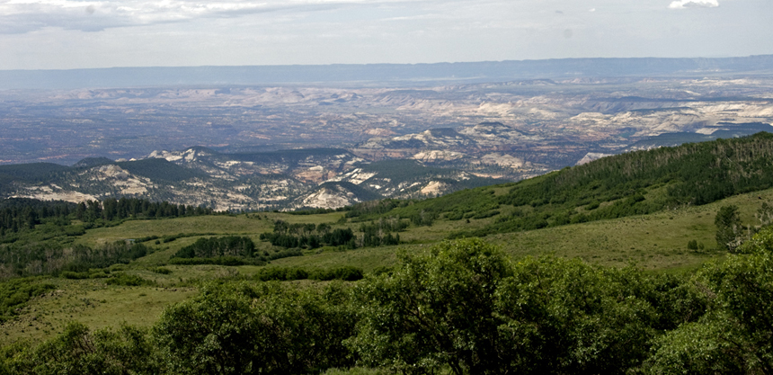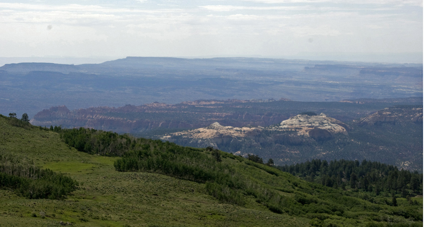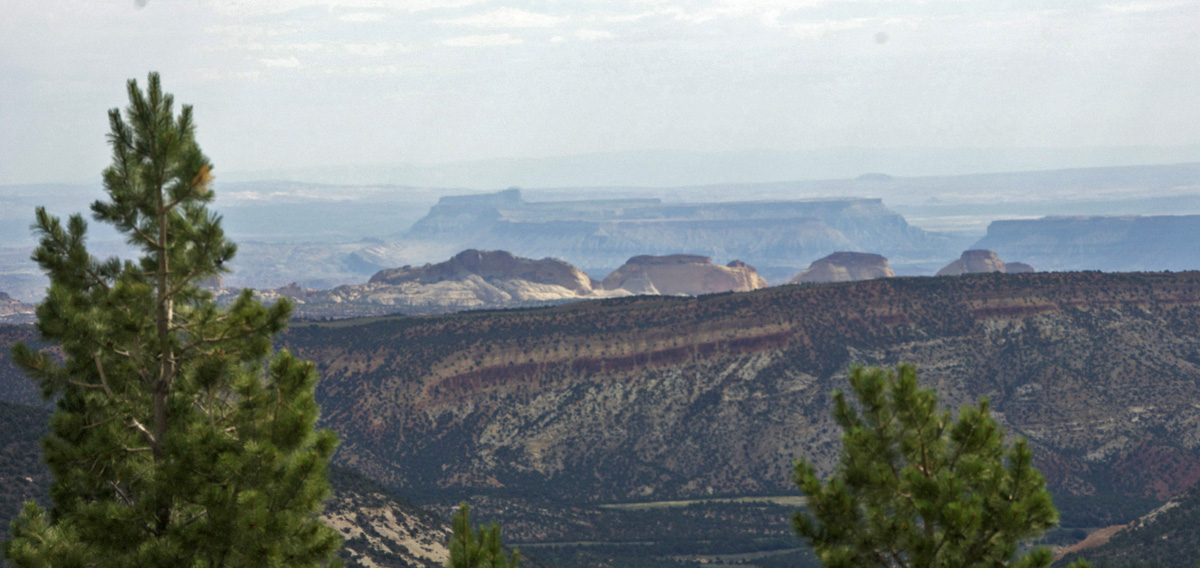 As we drove toward the downslope of the mountain that leads to Boulder Town, out to our left we look below southward across the southern stretch of the circle cliffs edge (at upper middle-left, while the more whitish peaks in nearer foreground and toward the far right are mostly Navajo Formation on the mountain's flanks, part of the near-remnant of the Circle Cliffs on this western side). Far beyond, stretching all the way across the horizon are the Straight Cliffs of the Kaiparowitz Plateau.