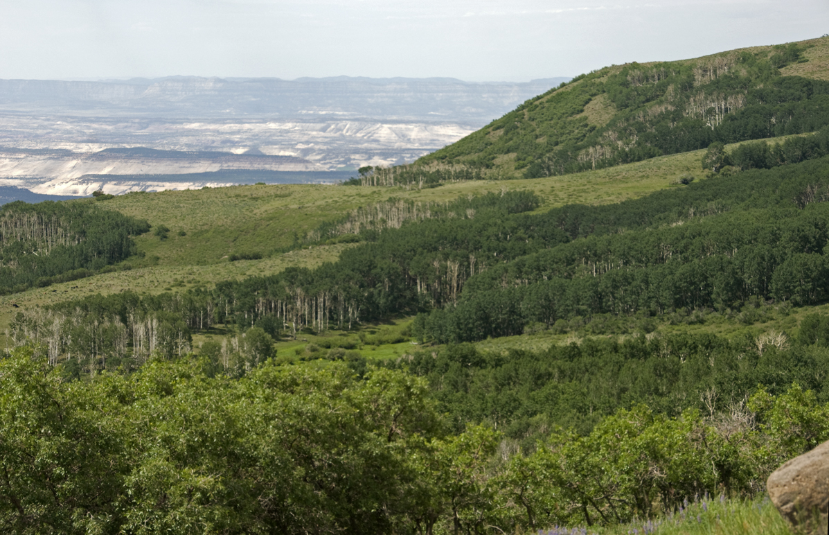 Bearing all this in mind, we continue our travels below along the flanks of Boulder Mountain on Hwy 12, here looking back toward the Northeast toward the southwestern flanks of the San Rafael Swell. In the middle foreground are more tetons of the Navajo Formation, which outcrops along the lower flanks of the mountain here and there, and beyond that lies the northern end of Miners Mountain. This mountain complex, deeply eroded from the Jurassic formations around its flanks into Triassic and even Paleozozoic layers (including the Kaibab Formation, topmost Permian layer at the Grand Canyon), forms a substantial uplift lens that is connected with the Circle Cliffs, but is set apart from it in the geological sources I have consulted, and clearly its erosional history is quite different.