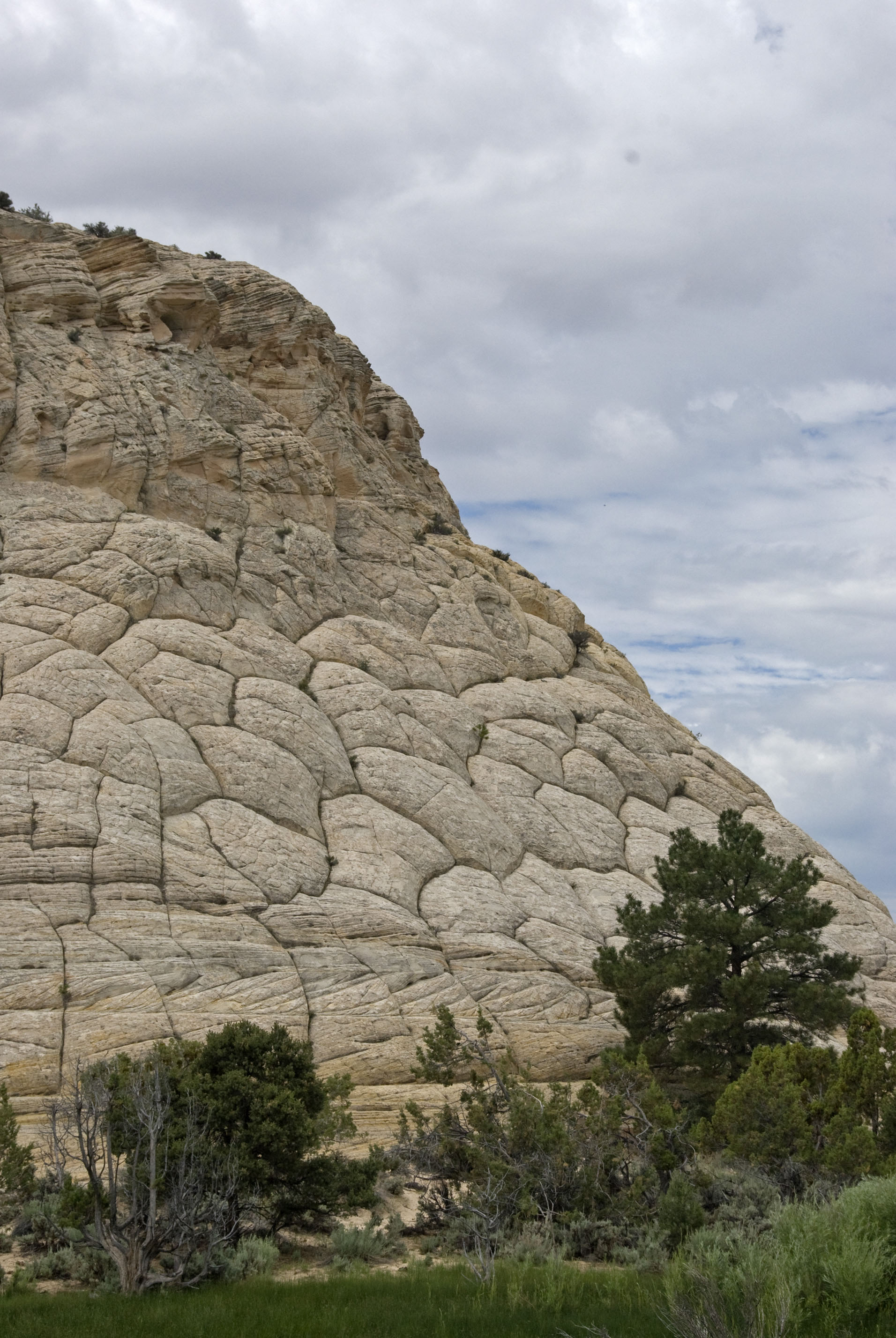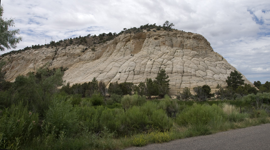 Boulder Town lies in a small, water-blessed valley at the mountain foot, draining into the Escalante River. Its beauty is enhanced by the massive Navajo Formation sandstones that rise around it, as this remarkable one below at the beginning of the Burr Trail. Click on the image for a close-up view of the strange pillowy-appearing edge shown at the right, the cause of which I have not been able to determine.