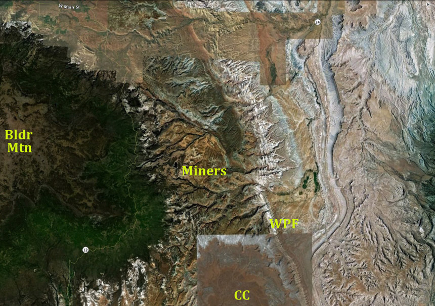 This high-elevation plateau (maximum elevation = 11,319 feet); mean elevation of mountain top = 10,836 feet), hosted a true ice cap with several outlet glaciers during the Last Glacial Maximum (26,000-19,000 years ago). Glacial Scouring and the heavy stream outwash sent down black boulders across the Fremont River valley and other drainages, eventually giving the mountain and its nearby town their names. On the image above you can make out the faint line of Highway 12, which runs along the flanks over mostly Quaternary alluvium produced during and after that time.