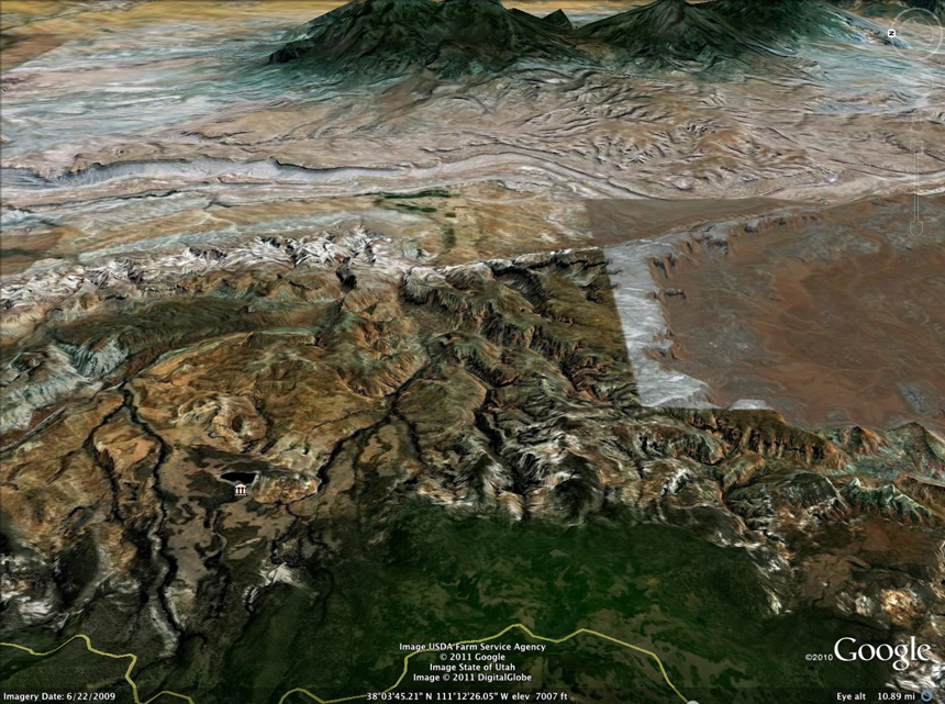 Above, in Google Earth satellite imagery, Boulder Mountain is the highest point and easternmost extension of the Aquarius Plateau, a massive Colorado Plateau remnant that displays largely horizontal sedimentary levels near sea level running from Paleozoic through Cretaceous times, then (after a period characterized by an extensive fresh-water lake) was extensively capped by Cenozoic (Oligocene and later) volcanic lava flows that formed the vast Marysville Volcanic Field (note the pale flat-top color at far left). These hard volcanic layers have protected this plateau edge from the erosion that has stripped away much of the land to the east. Click on the image to enlarge it.