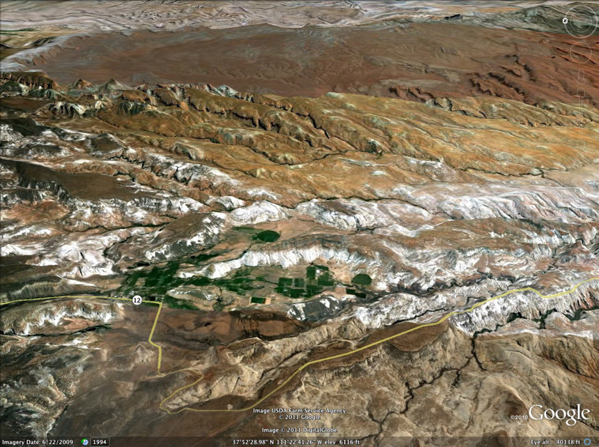 Below, another Google Earth satellite view from above Boulder Mountain, here looking out eastward toward the northernmost laccolith of the Henry Mountains. At lower to middle left, beyond the forested edge of Boulder Mountain and its Highway 12, you see a central part of the Miner Mountain Uplift, which down-dips into the white line of the Waterpocket Fold running laterally somewhat above left-center. You can see how deeply stream erosions have cut into this formation. At far right, you see the northern end of the Circle Cliffs Uplift, which presents a very different aspect to the viewer. From this perspective it looks more like a basin (with its encircling higher cliffs) than an uplift.