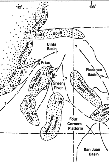 Apparently most geologists now agree that the earliest raising of the Plateau from its near sea level position began toward the close of the Cretaceous with the rise of the Sevier Orogeny to the west of the Hingeline (see "Campanian Thrust Belt" at right), and then the Laramide Orogeny east of the Plateau. These 80-50 mya compressions produced mountains to the west and east of the Plateau, but also, some somewhat later, the several more local uplifts we have already seen present in the region. However, the sequence of the High Plateaus also tells us that these early Plateau uplifts (San Rafael Swell, Circle Cliffs, Monument Uplift, et al) remained during that time at fairly low elevations, and were blanketed by sedimentary formations that appeared during and even after their rise. The map at right shows erosion flows from the mountains raised by the "latest Campanian Thrust", with subsidiary flows from the contemporary uplifts with which we are all now somewhat familiar, which during and after the end of the Cretaceous raised sediments in the basins to the east and north,