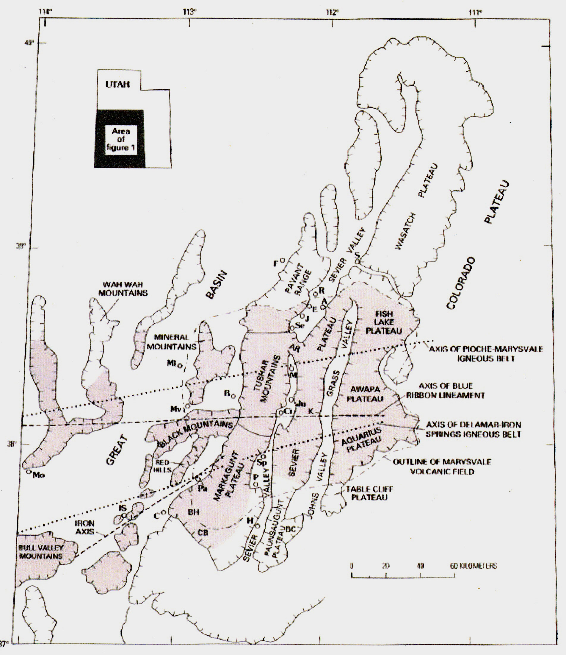 The map at left shows the northwestern portion of the Colorado Plateau, which is distinguished as the High Plateaus section, characterized by high, north-trending plateaus, separated from each other by major faults and grabens. The western portion straddles both Plateau and Basin-Range, marking a transition between the two. The map (adapted from Rowley et al 2002) also shows in faint pink most of the vast Marysville Volcanic Field, of which the Boulder Mountain volcanic top is a part. Boulder Mountain is located on the map as the pink protrusion at far lower right of the Aquarius Plateau portion. For a full view of the Field, click on the map to enlarge it.