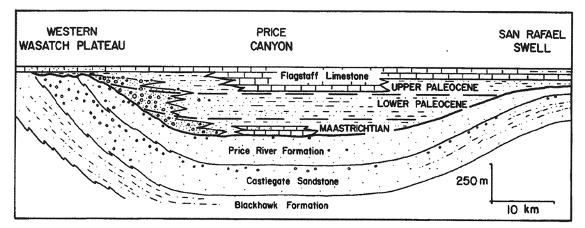 The widespread presence of a later, mainly freshwater-lacustrine Lake Flagstaff during the Upper Paleocene in this area shows that by that time (58-55 mya), both Plateaus and uplifts had become flattened out beneath yet another sedimentary layer. The image below shows both the San Rafael Swell and the Western Wasatch Plateau (as well as basins in between) lying below the Flagstaff Formation, relic of a lake whose size remains a question for geologists (some reports show it running from East-Central Utah all the way to its southwestern corner) but which definitely existed near the Circle Cliffs of our area (forming a sedimentary layer in Boulder Mountain strata):