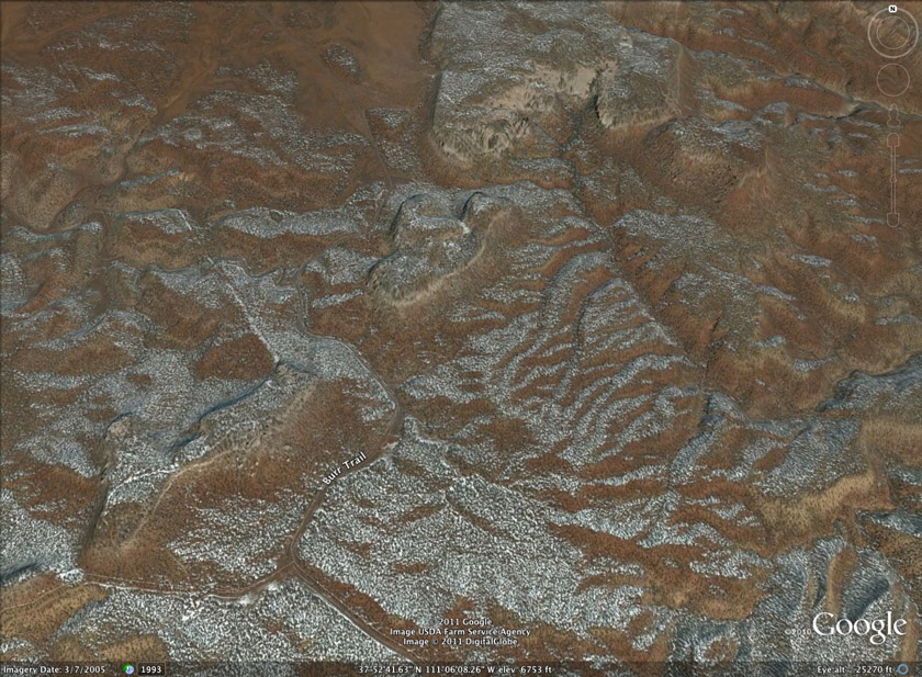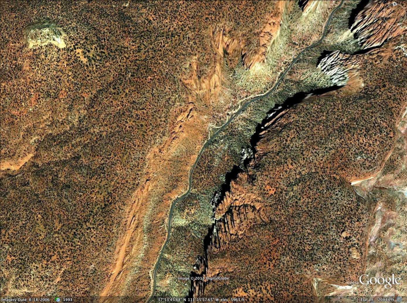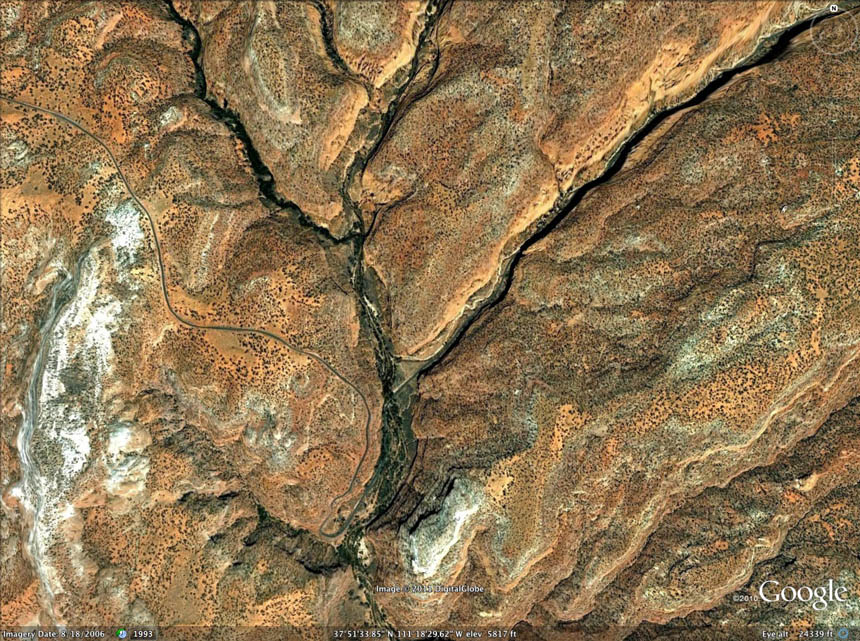 Below, the Burr Trail meets The Gulch, and the Long Canyon, which stretches to the far upper right at the top of this North-South image. You cen see below the middle where the road presents an overlook northeastward straight up the Long Canyon, where we will go. The Gulch forms the more-or-less straight-north branch of this dendritic system. Here's a link that takes you along the larger drainage system of which this is a part: The Gulch.