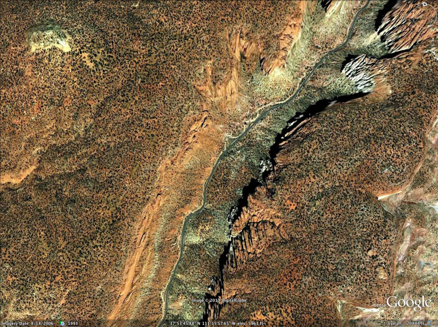 Below, Google Earth's satellite image gives you some idea of the visual shock we experienced when the Canyon abruptly ends: here the view to the top is toward the northeast, and you can see the roadway leading out to the edge of the western escarpment. There, to the right of the road, Kayenta Formation has been completely eroded away leaving the lighter-colored Wingate Sandstone. Click on the image to enlarge it.
