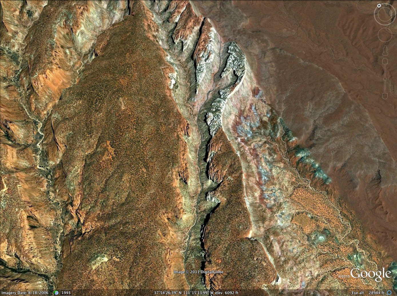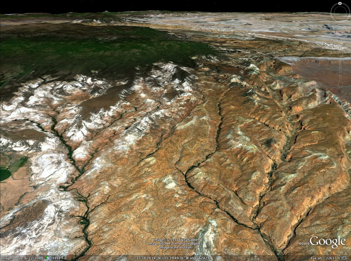 Below, while we don't go near a good Escalante River vantage point on this trip, it's convenient that Wikipedia provides this beautiful image of that river drainage from far downstream, looking upstream along a portion of the riverbed, with the Aquarius Plateau stretching across the horizon from west to east. Click on the image to enlarge it. Here too the river cut takes us down into much older rocks than the Navajo which blanket the field with white below the horizon. This is the general area addressed in my brief commentary on Why the CP Obsession?