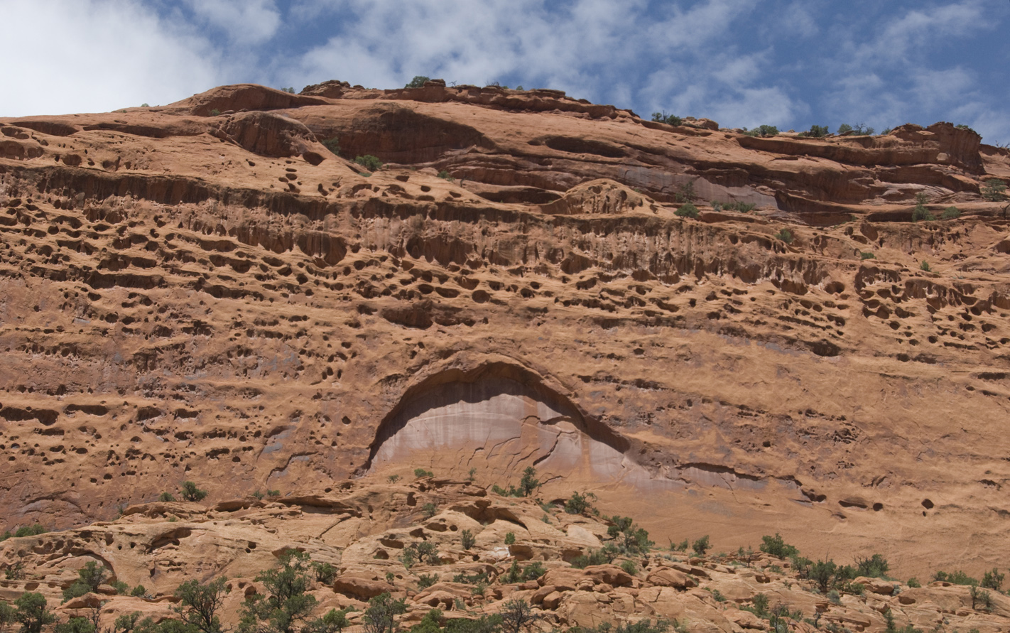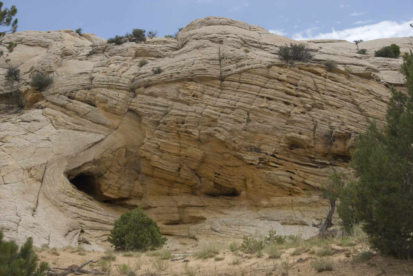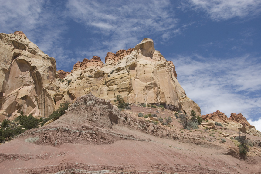 Below, shortly into our Burr Trail travels toward the east, we encountered another remarkable example of deformed Navajo Sandstone. More will be said about its profound deformations in the subsequent section. Click on the image to enlarge it.