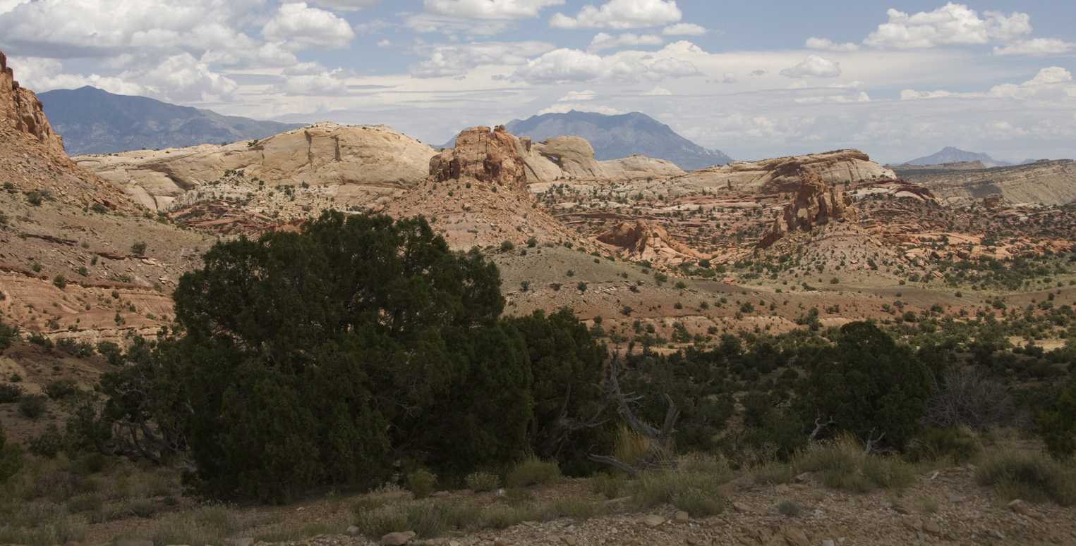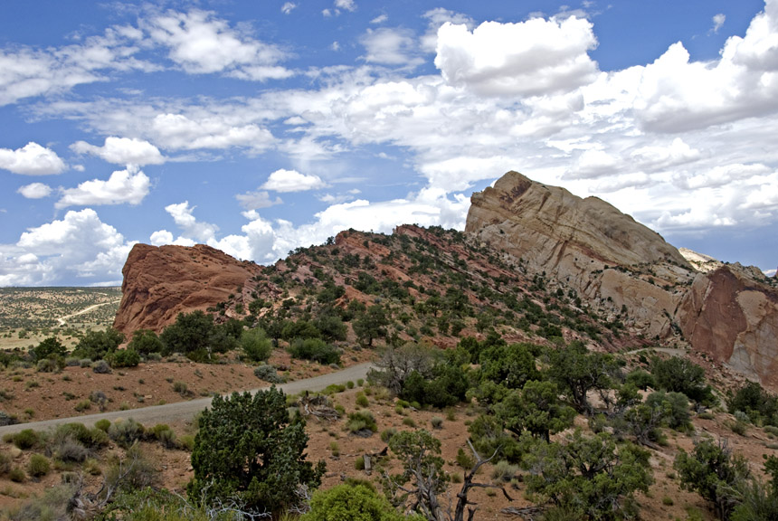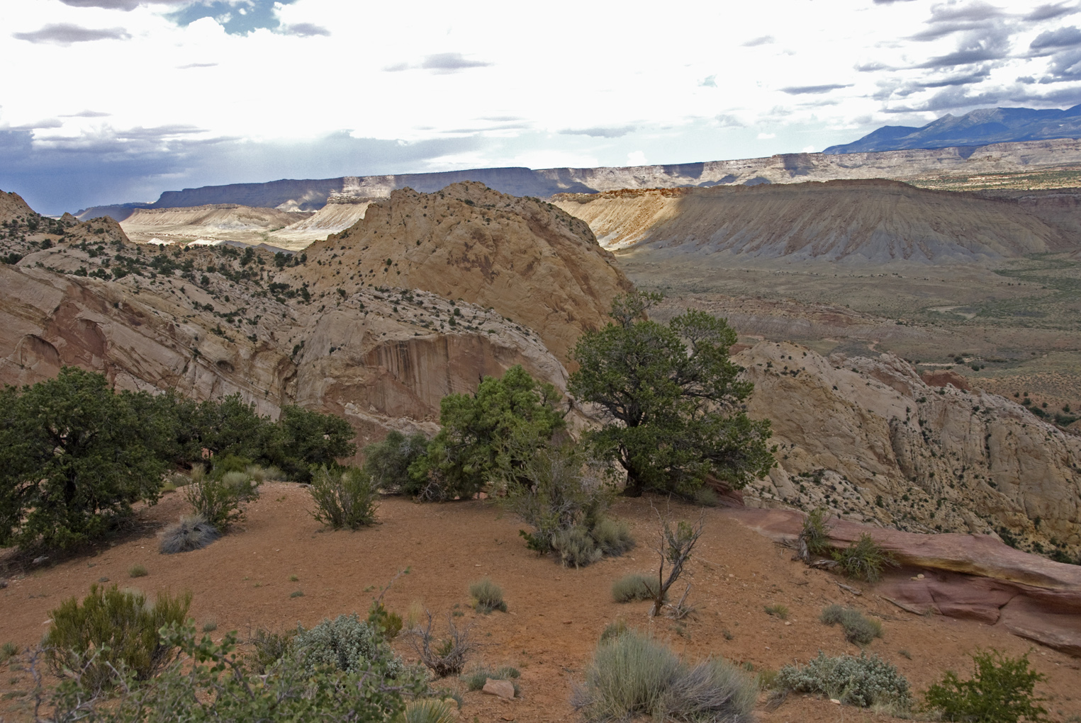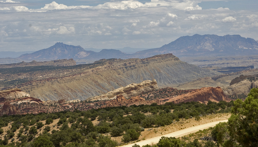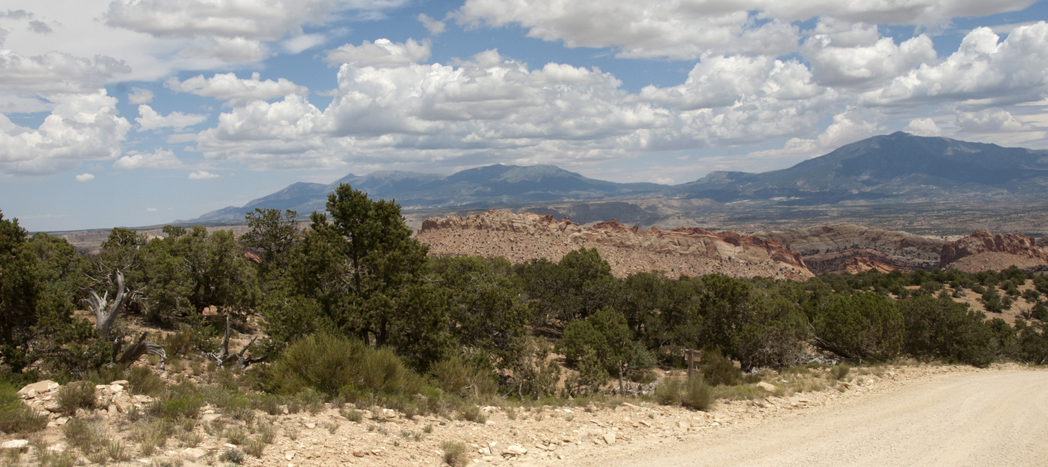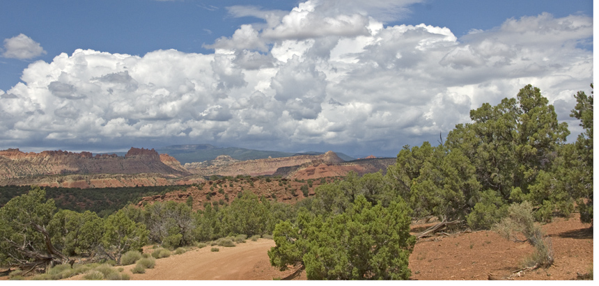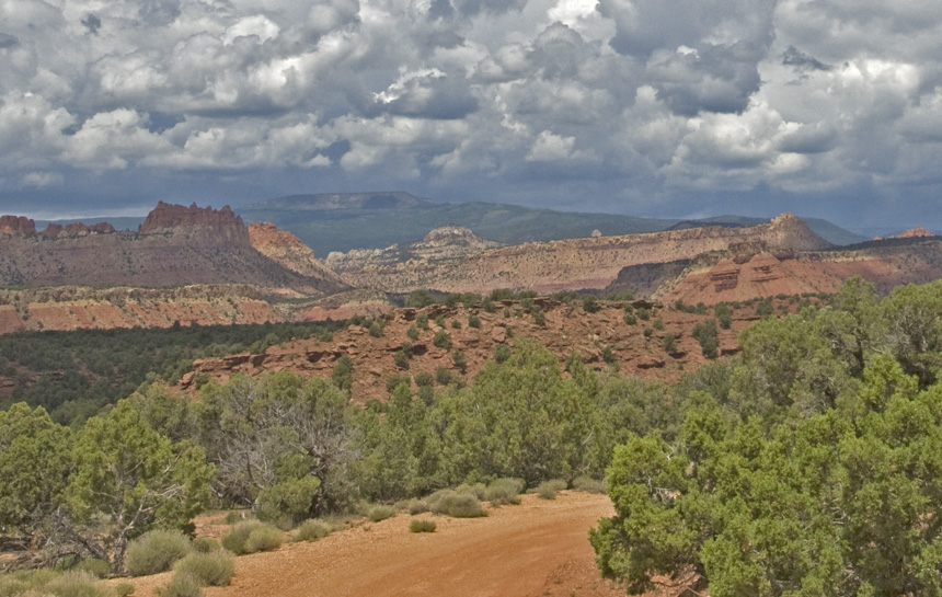 Below, our main image from driving the central portion of the uplift (the large cloud formation looming to the north over yet beyond Boulder Mountain was giving us cause for concern in light of recent very heavy rains) is this scene. Most striking is the view over the encircling cliffs to the central portion of Boulder Mountain, its flat volcanic top darkened by clouds but clearly visible to the norhwest.