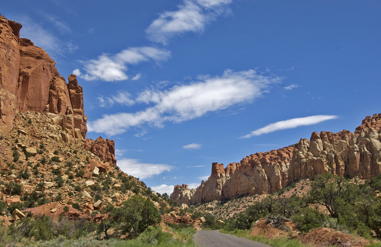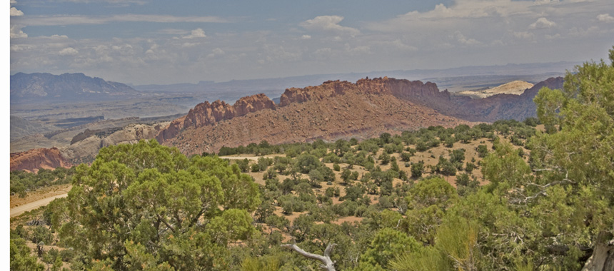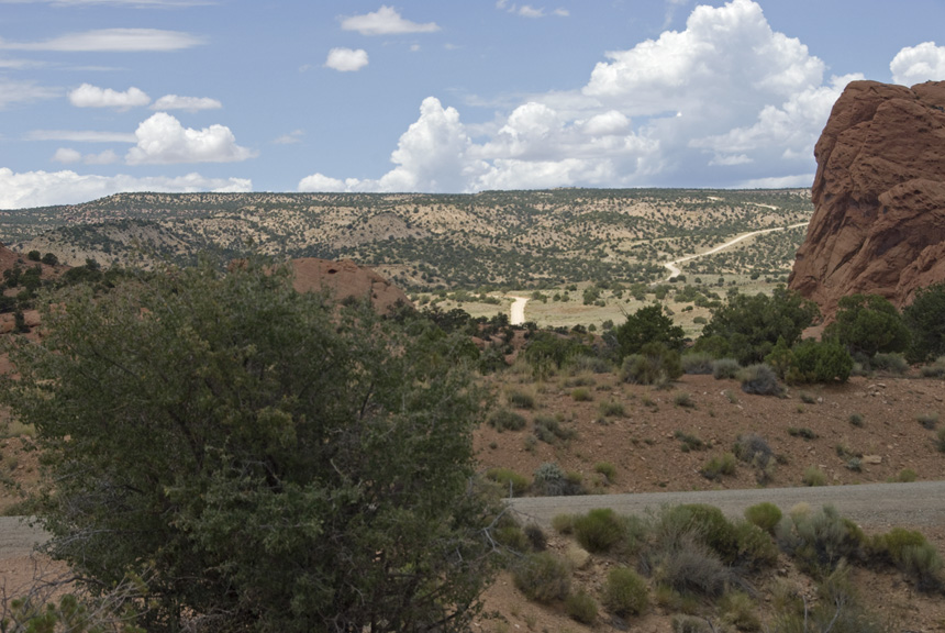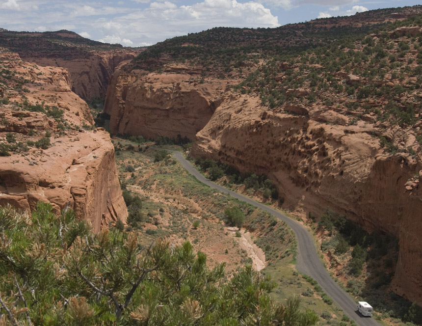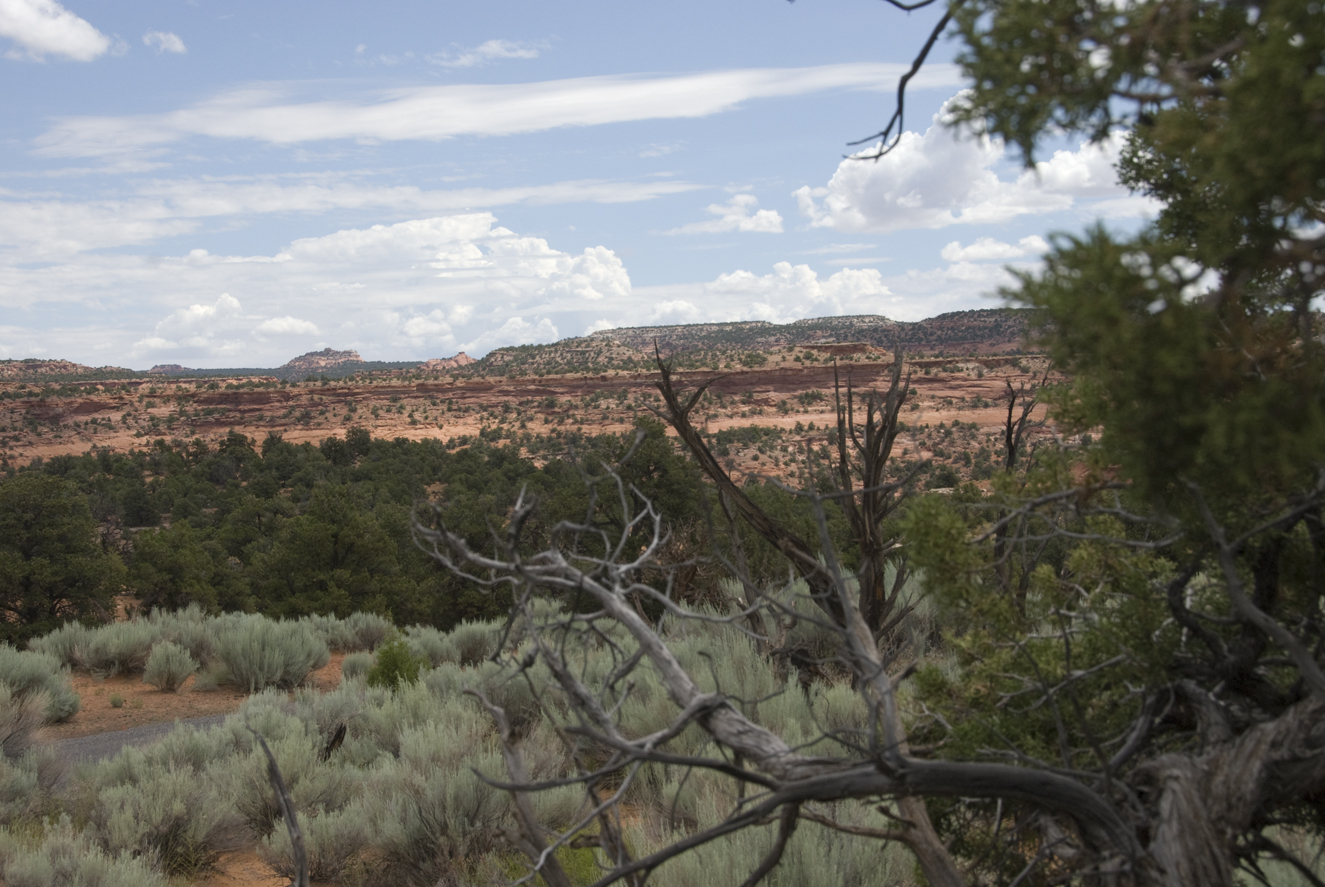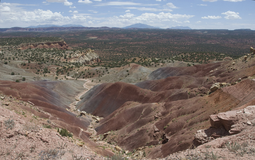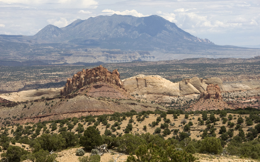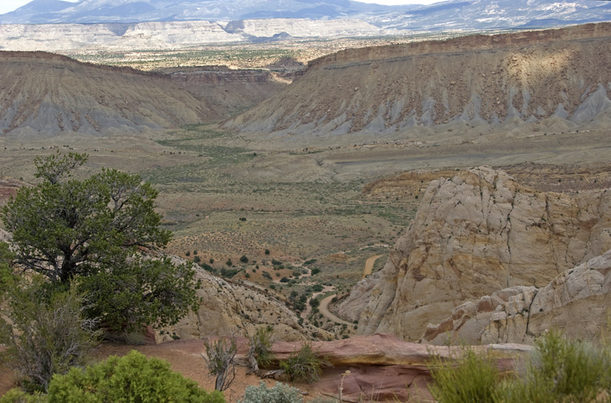 Below, our main image from driving the central portion of the uplift (the large cloud formation looming to the north over yet beyond Boulder Mountain was giving us cause for concern in light of recent very heavy rains) is this scene. Most striking is the view over the encircling cliffs to the central portion of Boulder Mountain, its flat volcanic top darkened by clouds but clearly visible to the norhwest.