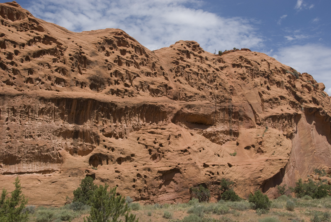 Below that runs a sequence of slopes and small ledges that marks the Owl Rock Member, composed of red, brown, and greenish-gray sandstone and mudstone, with occasional greenish-gray thin lenticular limestone beds.This is the array we see here running down to the road below the Church Rock Member, and it has thicknesses from 150 to 250 feet.