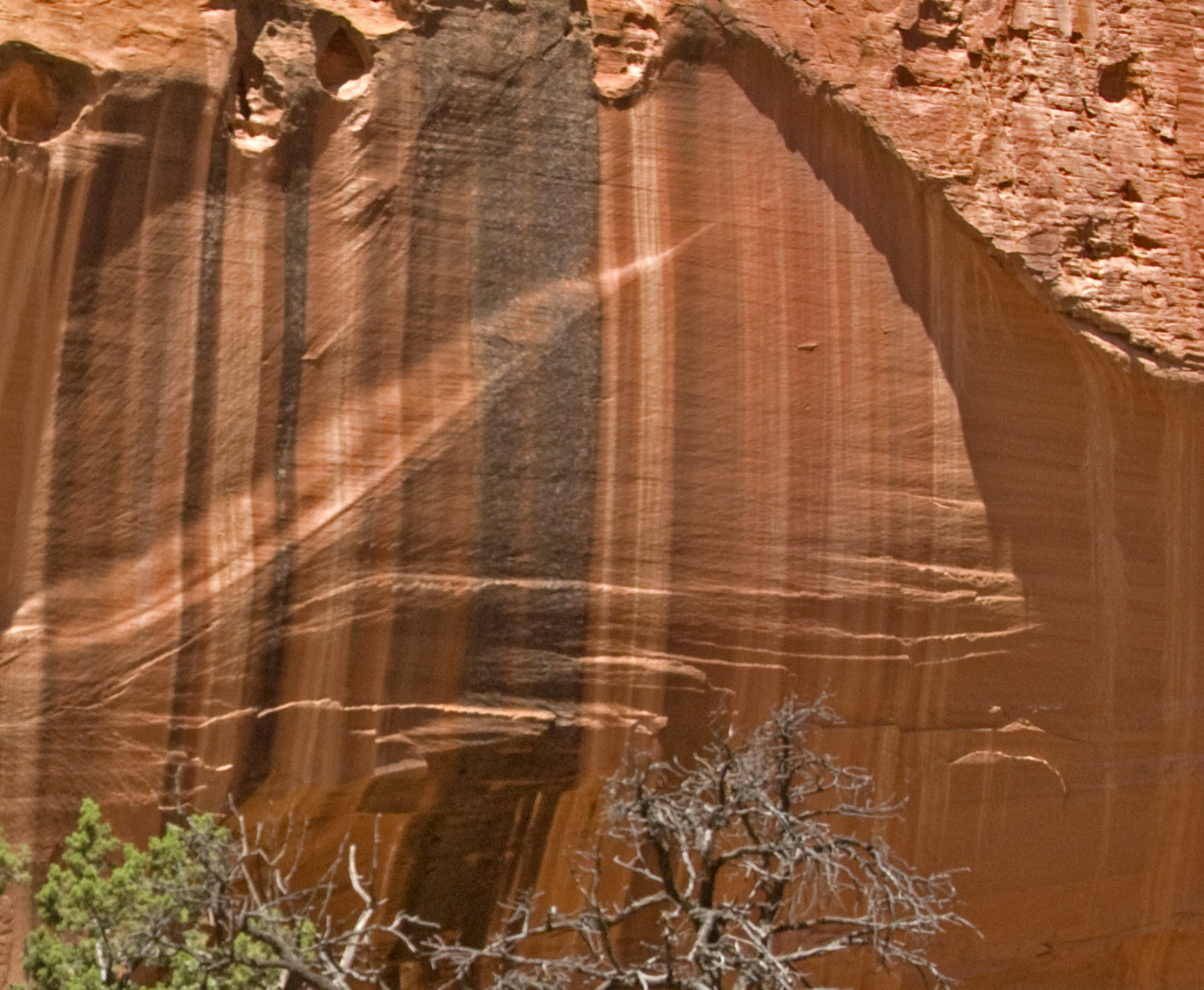 Here below we encountered another visually stunning point of view. Towering overhead, we observed a veritable Sphinx-bird of Wingate, whose backbones are Kayenta-red. Steed's description: "The Wingate is massive, cross-bedded, red to light buff, fine- to medium-grained quartz sandstone. It forms a vertical cliff that completely rings Circle Cliffs anticline." This formation is, like its later Glen Canyon co-Member the Navajo, predominently an eolian deposit, and is some 280 feet thick in places here. Though not as geographically extensive as the later Navajo, Wingate formed an erg over much of northeastern Arizona and central Utah, with sands that blew in from the Oachita-Appalachian Mountains complex (extending from central Texas far to the southeast).