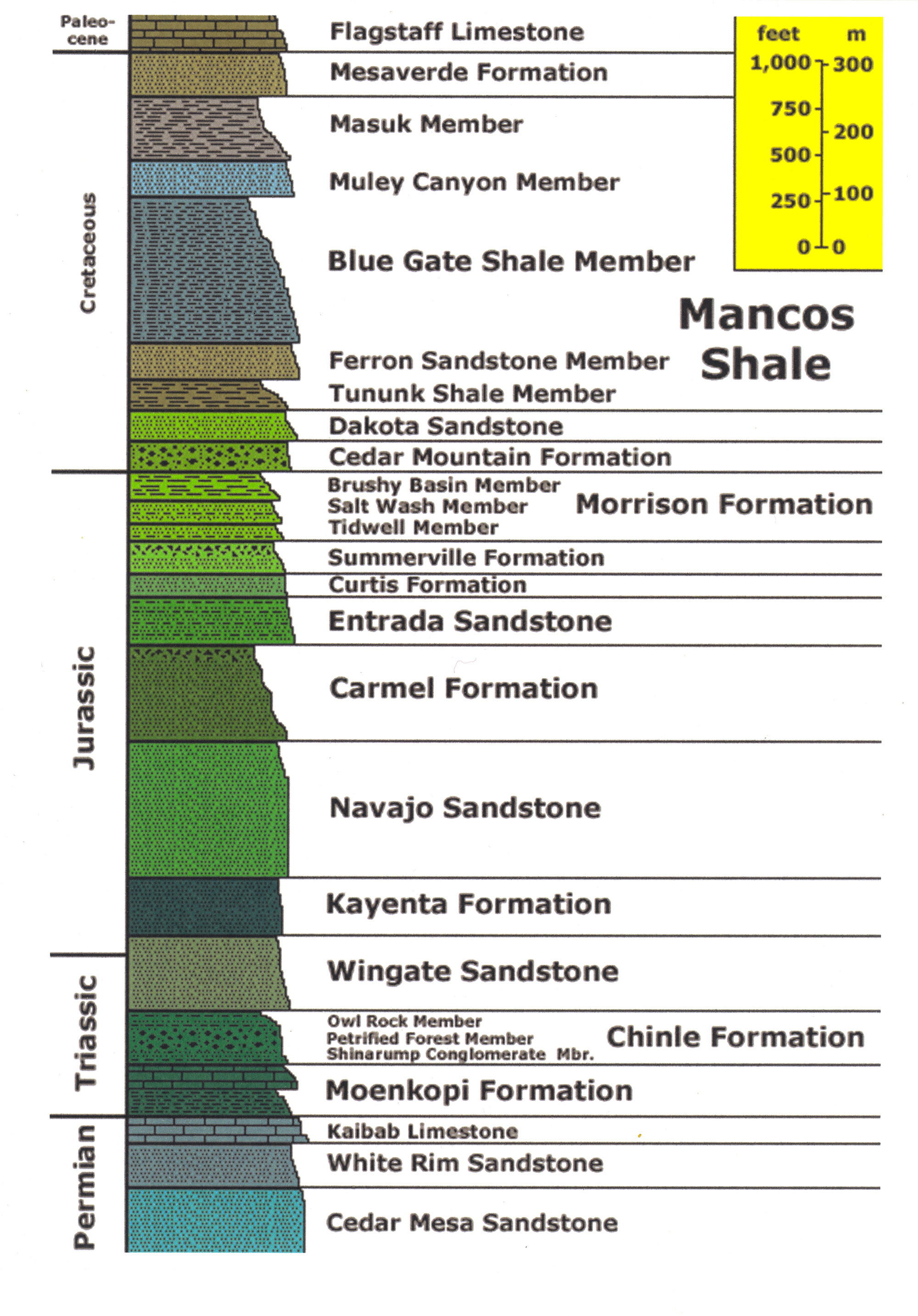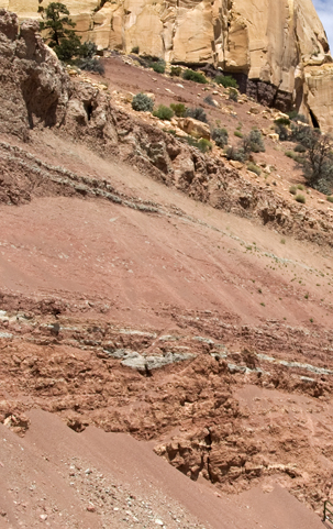 This image also nicely shows how the Wingate lies directly and unconformably over the Triassic Chinle Formation, more on which in a moment. Click on the image to enlarge it.