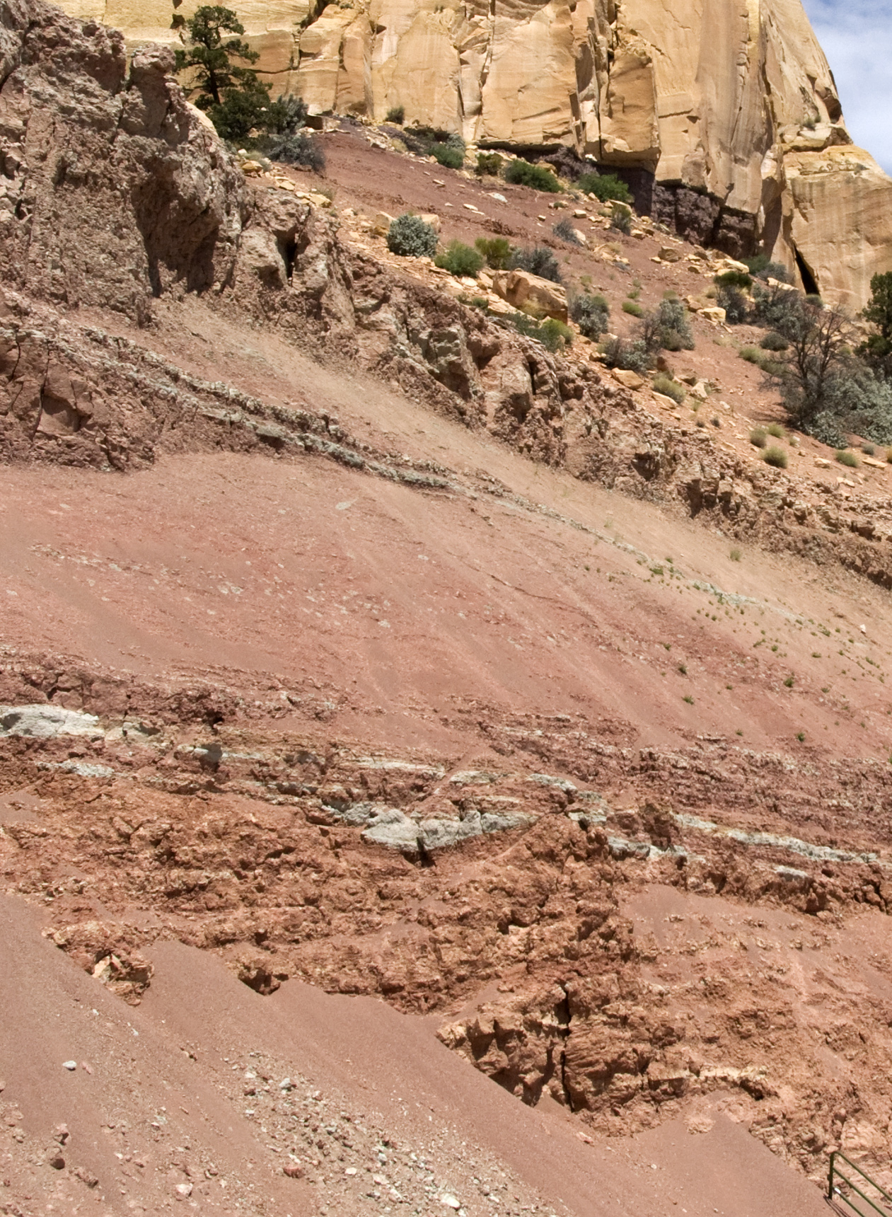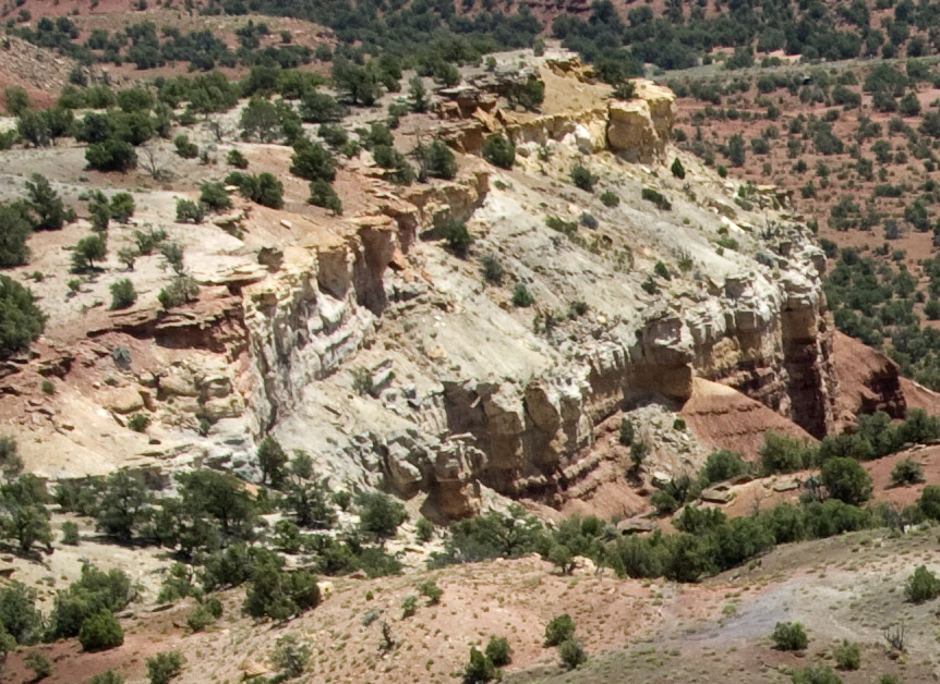 Below, a closeup view of the rocks further down the slope from the Bentonitic shapes: these whitish cliffs and ledges may comprise the Shinarump Member, medium-grained thin to thick crossbedded sandstone; interbedded white thin-bedded sandstone and greenish-gray mudstone, and light-yellow very thick bedded sandstone. It contains carbonaceous and charcoaly material. This low to lowest Member of the Chinle forms a hard cap that protects the softer (and unconforming) layers of the Moenkopi Formation. This too is our guesswork, but the underlying rocks do have a definitely Moenkopi look. More on this point shortly.