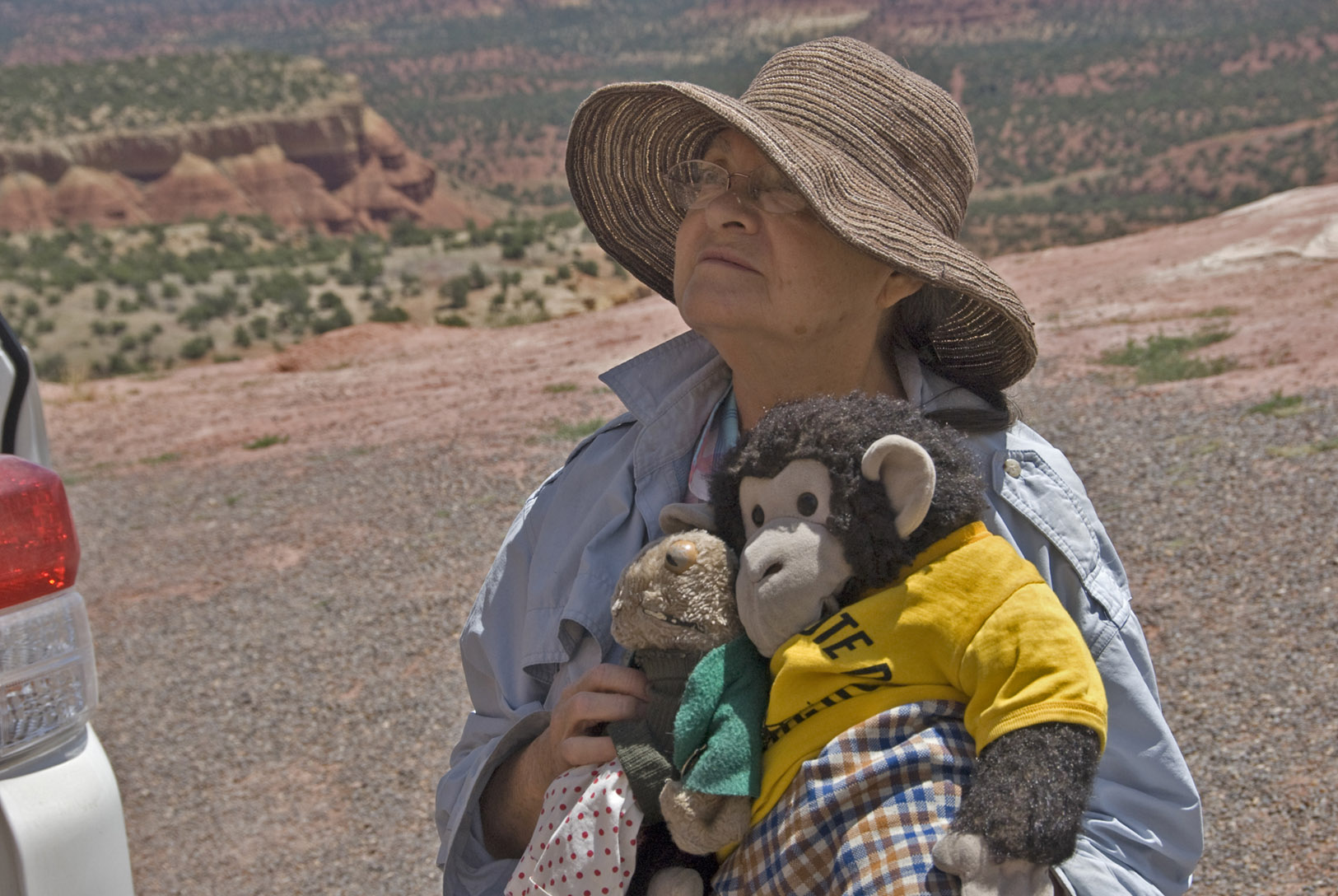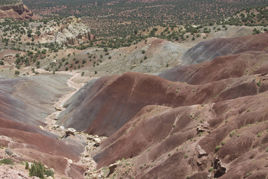 Everywhere here, the upper, softer portions of the Chinle Formation are long gone via erosion mainly into the Escalante River. The Burr Trail runs somewhat diagonally down through left center (right of the straight white streak) to the bottom of the image. Some of the canyons in this central zone cut way down through the Moenkopi Triassic Formation and into Permian Kaibab marine limestones and deeper. We "saw" none of this as we passed.