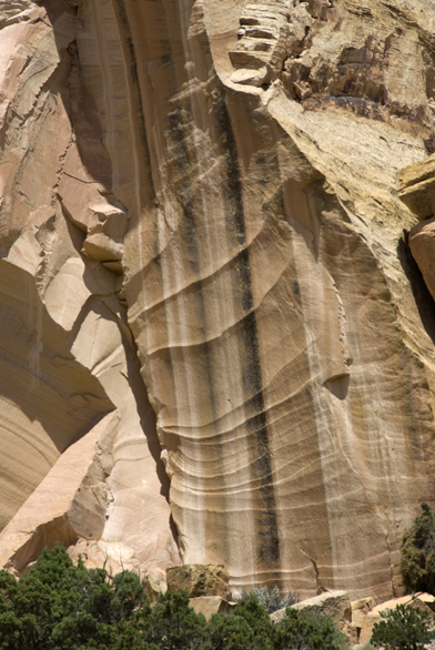Below left, a closeup view of desert varnish running down the Wingate overhang shown at middle left above. Note the lines of deformation stress running laterally across the face. Here Helen Henderson and two friends admire it with rapt attention. Click on each image to enlarge it.