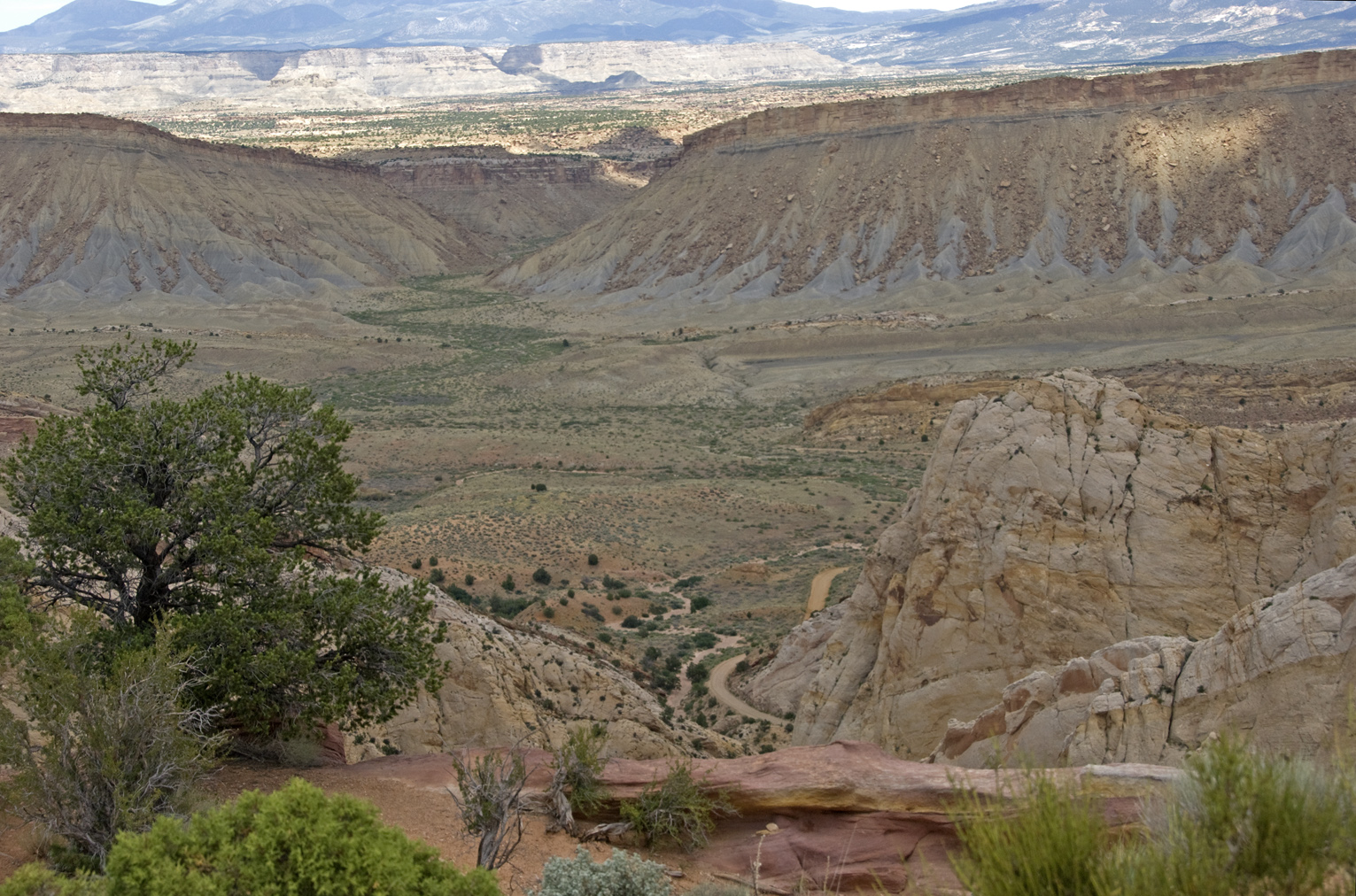 And at last, below, we see clearly the expanse of the Waterpocket Fold, a vast two-sided valley opens out, lit by afternoon light: Click on the image to enlarge it.