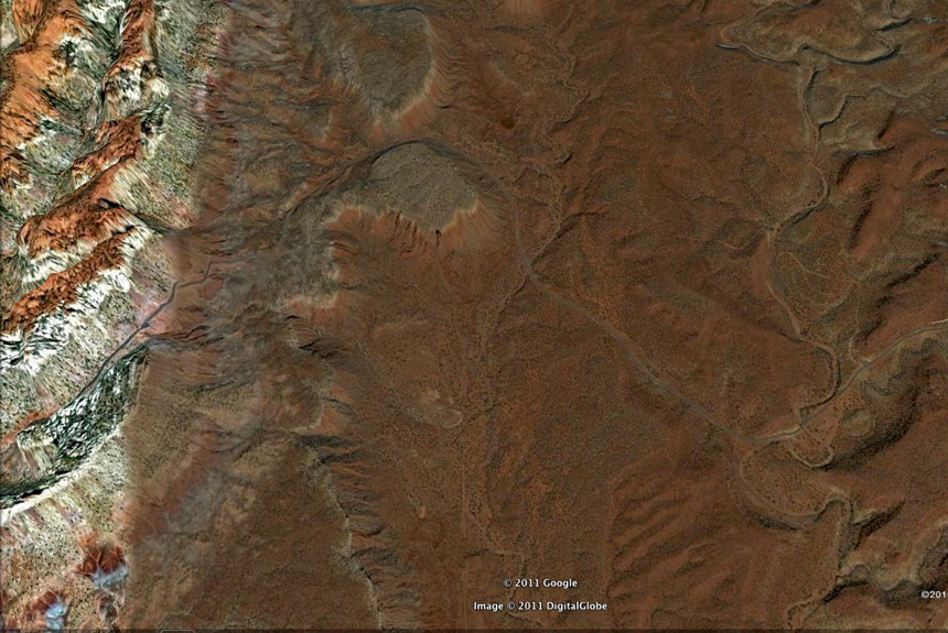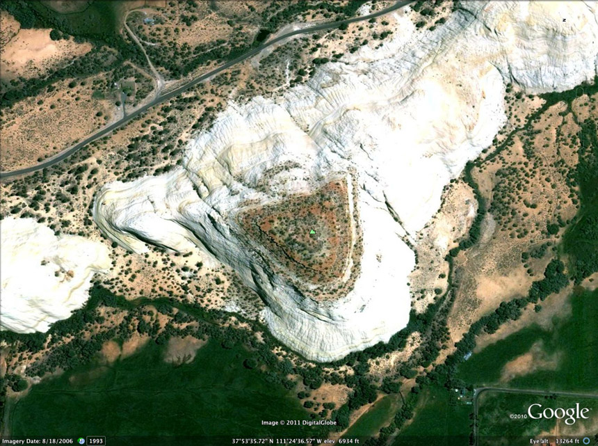 Above, a Google Satellite view of Sugarloaf Butte in Boulder Town, alongside the beginning of the Burr Trail (the road at top left). Part of the western slope of the Circle Cliffs, this striking hill is predominantly Navajo Sandstone but is topped by layers of brownish to reddish-purple, gypsiferous (but quite hard) siltstone of the Carmel Formation of the Middle Jurassic period (ca 170mya, when seas again extended into this area).