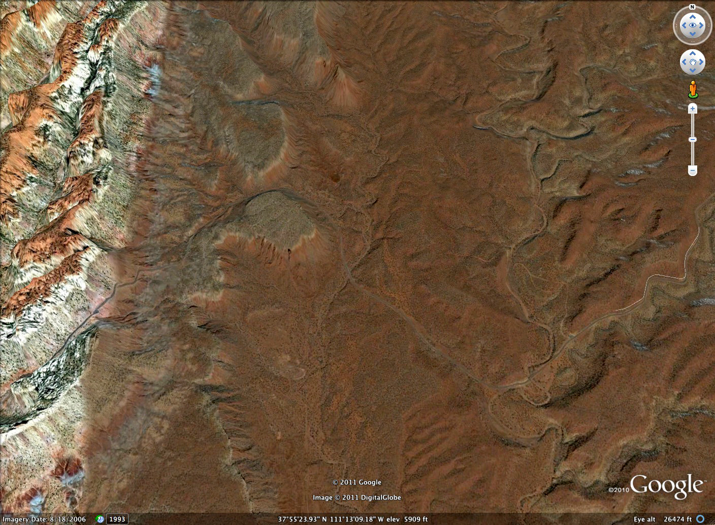 Below, Google Earth shows us the route of the Burr Trail as it moves (lower-middle far left) out into the central, depressed portion of the Uplift. You can see the road swing northeast between two buttes, then it angles southeastward to the lower right until it crosses a small wash, then rises east-northeastward. Click on the image for a wider and larger view of the center of the uplift. The two buttes at upper left are topped by the Shinarup Member of the Chinle, here looking pale gray, which forms a discontinuous bluff (the inner escarpment) within the Circle Cliffs, part of which you can see below at far lower left. It is also the supporting cap on several buttes and benches within the enclosed basin.protects the softer, underlying and softer Moenkopi of the earlier Triassic (see Blakely et al new map for Early Triassic Moenkopi).