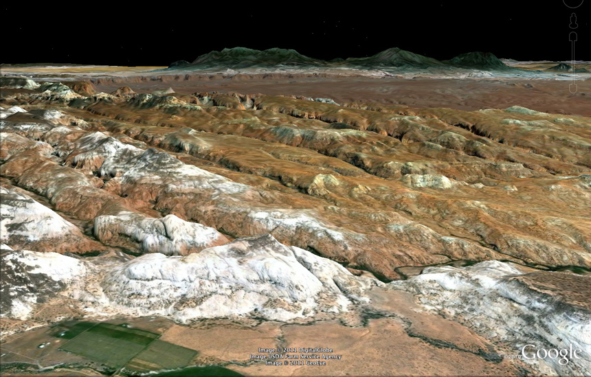 Below, Google Earth gives a 3-D Satellite view of this terrain from the perspective of Boulder Town at far lower right and looking east toward the Henry Mountains. These near terrains show scattered remnants of Navajo Formation toward the western side of the Circle Cliffs, with plateau strips exposing the earlier Kayenta Formation beneath Navajo, running roughly north to south toward the Escalante River.