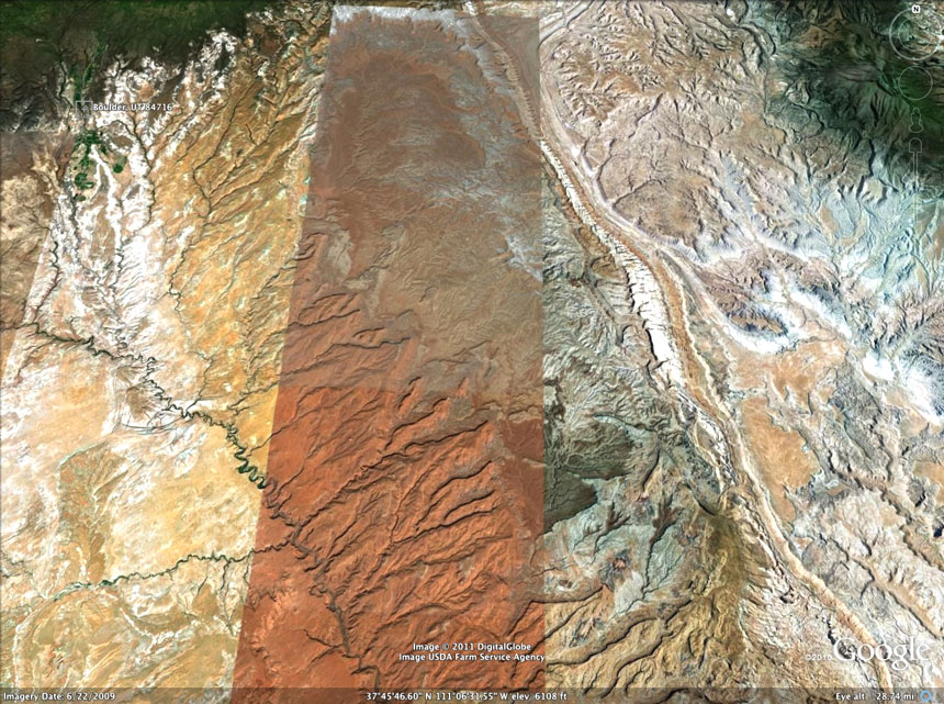 Below, this Google Satellite image shows the major part of the Circle Cliffs in our area (looking North), with its eastern margin, the Waterpocket Fold, running in a predominantly white line from top-center to lower right. The intensified redness of the middle vertical strip is to considerable extent an artifact of photography (as is the sharply yellowish imagery) , but there is in fact a color difference in the upper-middle portion of that strip, marking the geologically central dome of the Circle Cliffs Uplift. Remarkably, this dome-center is in part a depression in the anticline, due to the nature of the rocks in and around it and the way erosion has drained the dome into the Escalante Riover system. As Steed put it: