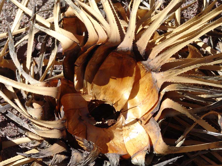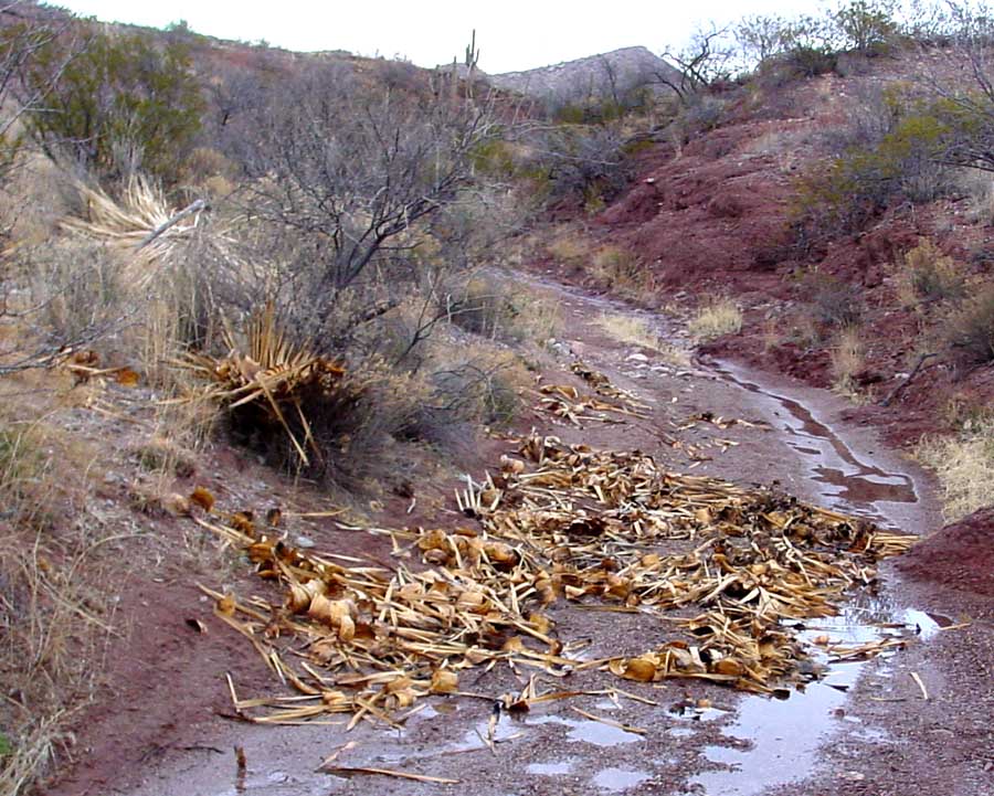 The name "Desert Spoon" derives from the distinctive shape of the enlarged bases of these leaves, which clasp the stem in densely overlapping spirals, producing the leaf-rosette patterns so typical of Agaves (Bowers, cited above p. 33). Some of the "spoons" may be seen below left, scattered along the edge of the Red Tank Wash after a rain, after hungry Javelinas had demolished most of the mother plant (at left-center in the photo), which had previously died. Below right, a close view of an array of "spoons" remaining after those above have been removed.