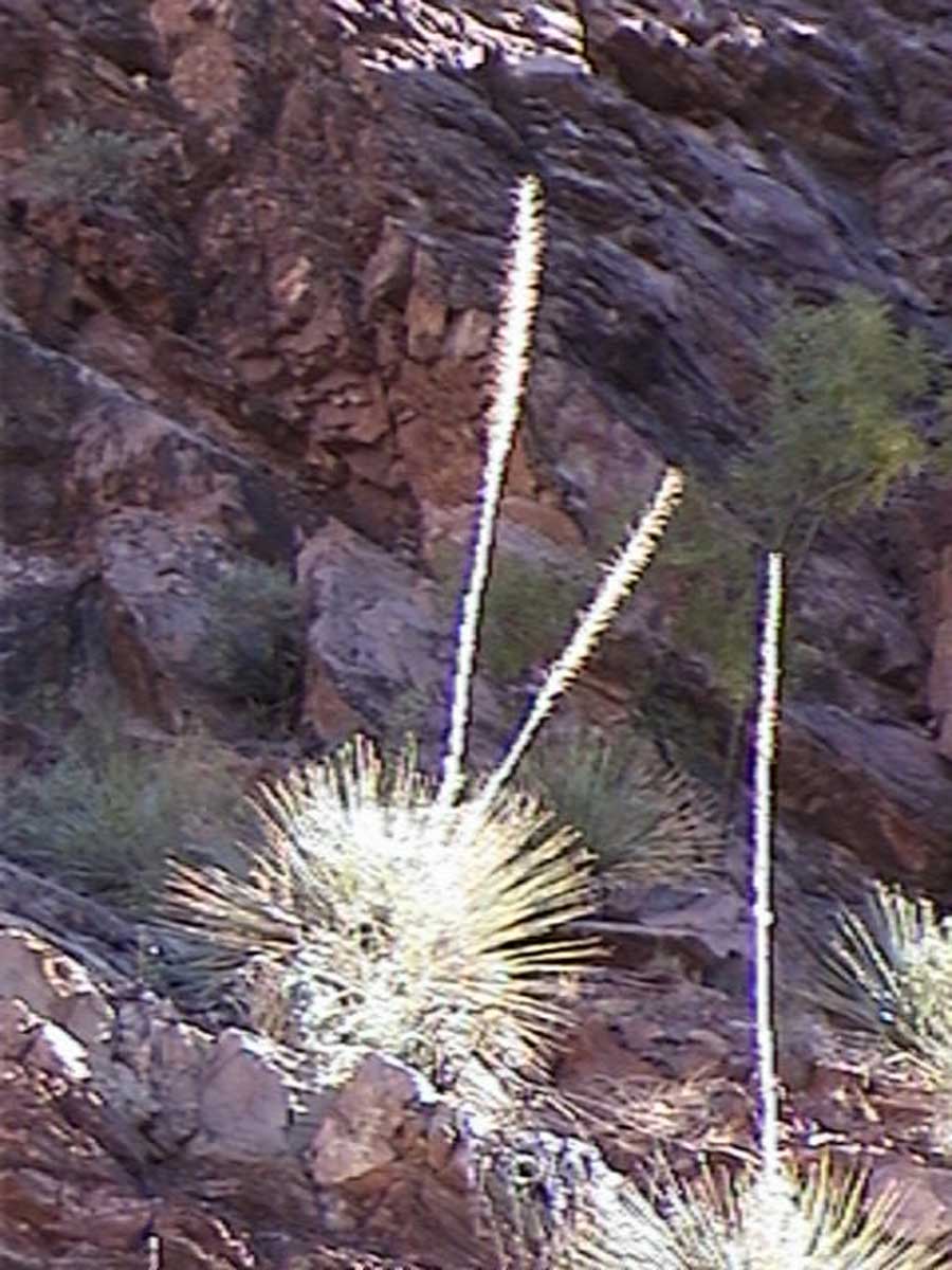 While they present a somewhat baleful prospect to hikers, shindaggers produce very beautiful flowers when fully in bloom. A short walk east from Old Hunters Camp, at the base of Sierra Blanca, in June 1995 we captured a field of blooms with our old video camera (the last time we saw such a display):