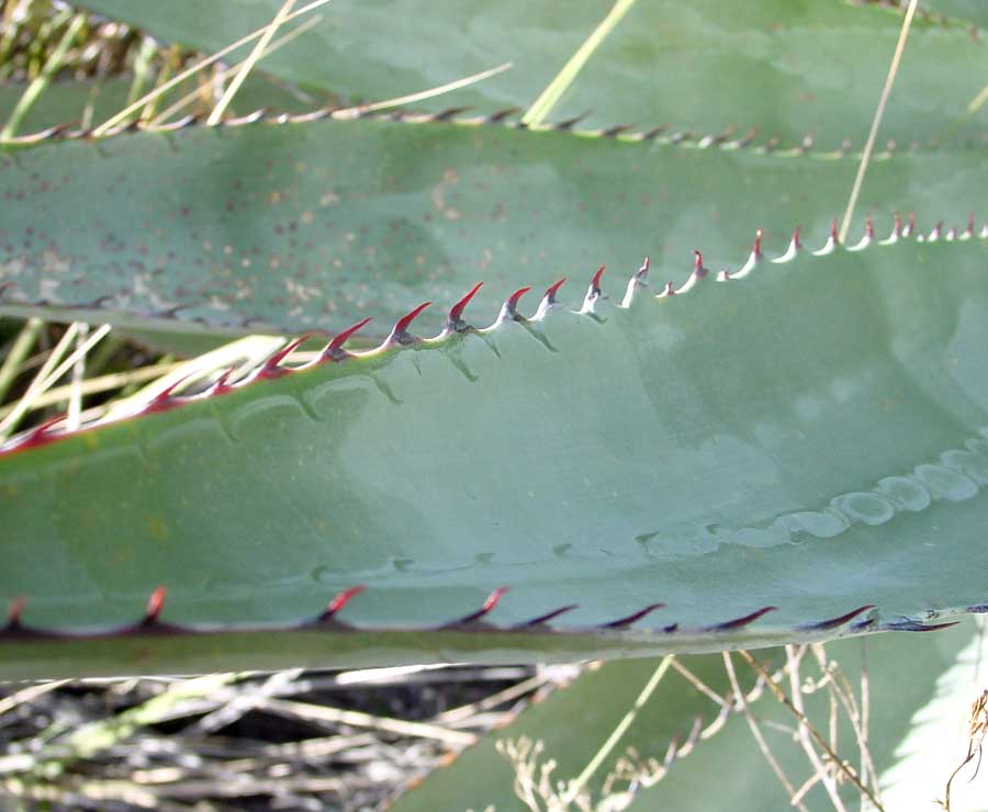 The photographs below show a feature that distinguishes most agaves from the yuccas or the (African) aloes -- sharp, stiff spines distributed along the sides of the leaves as well as a single needle-point at the tip. (Leaf color is rather variable in this beautiful plant.) (Click on each image to enlarge it.)