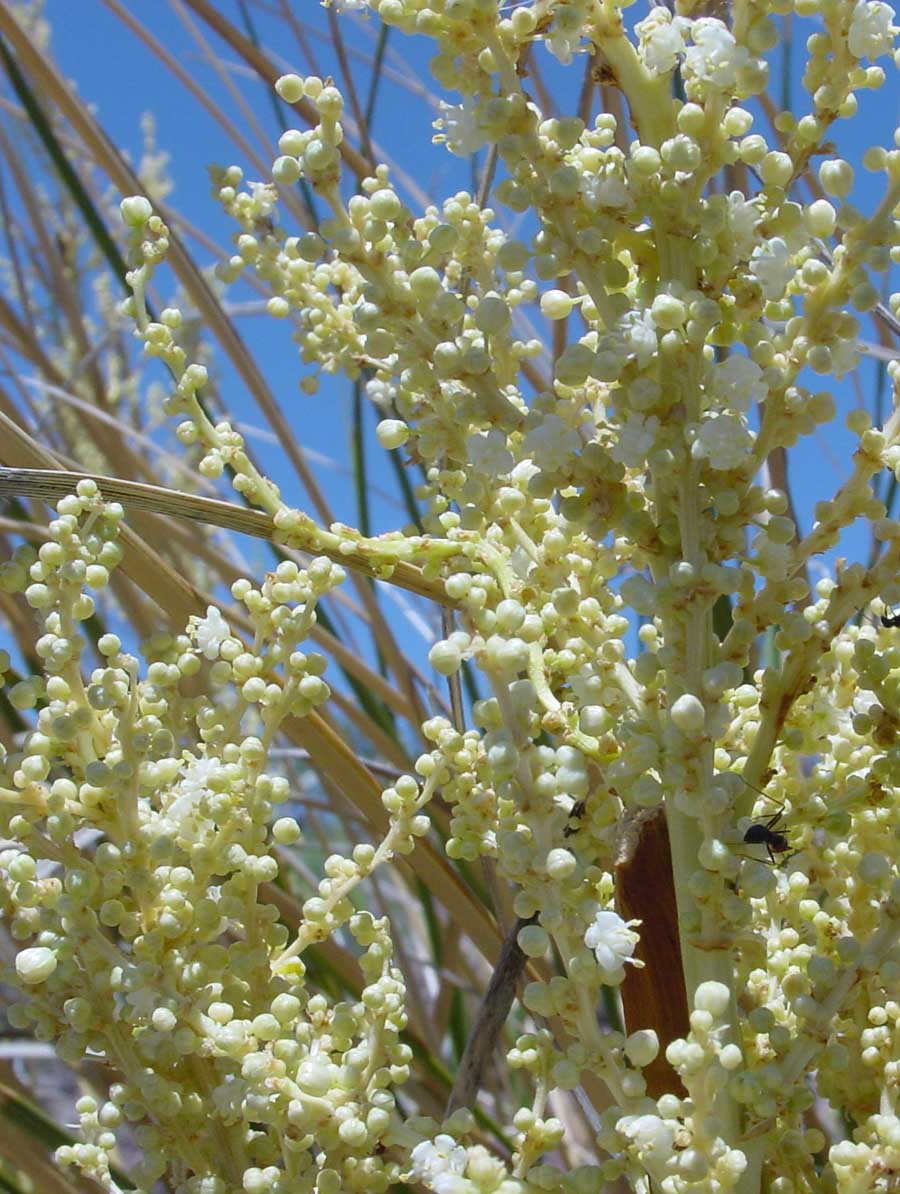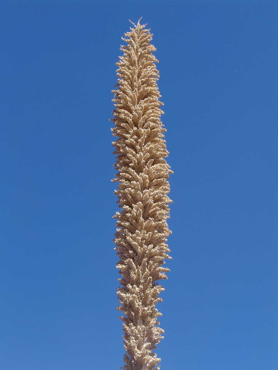 It flowers once every several years, sending up a stalk in May 2004 (below left), each plant's tall, densely-branched inflorescence eventually bearing thousands of small whitish flowers. Below center, a close view of a seeding stalk in September 2007. Below right, old stalks remain on surviving plants in November of 2002 in Upper Hot Springs Canyon. Unlike Agaves, Sotol does not die after a single flowering. (Click on each image to enlarge it.)