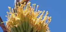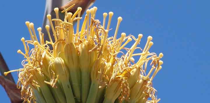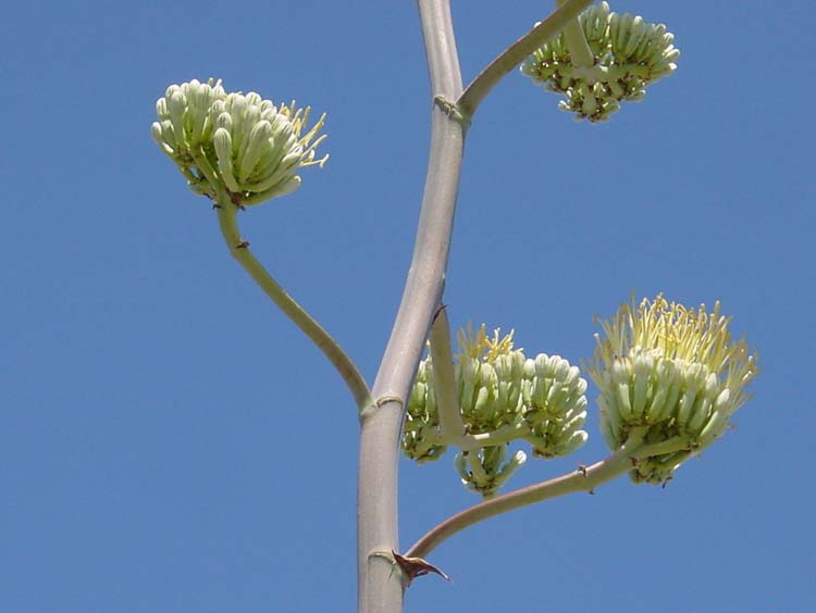 Agaves are purely New World plants in origin (though since the 1500s C.E. humans have now spread them much more widely around the world), ranging in size from the tiny mescalito (the size of an apple) to the Mexican giant maguey which may weigh over a ton. All Agaves have rather thick, succulent leaves that form rosettes, and most are stemless so they tend to form rather tight clusters. Leaves vary widely in color and size, but leaf edges are usually lined with numerous sharp spines and each leaf is tipped with a single sharp spine. Flowers emerge on a single vertical stalk that grows out of the center of the rosette (and to which the name "agave" alludes), and most species bloom only once and then die (anywhere from 3 to 50 years depending on species). But most Agaves actually multiply mainly by means of underground suckers.