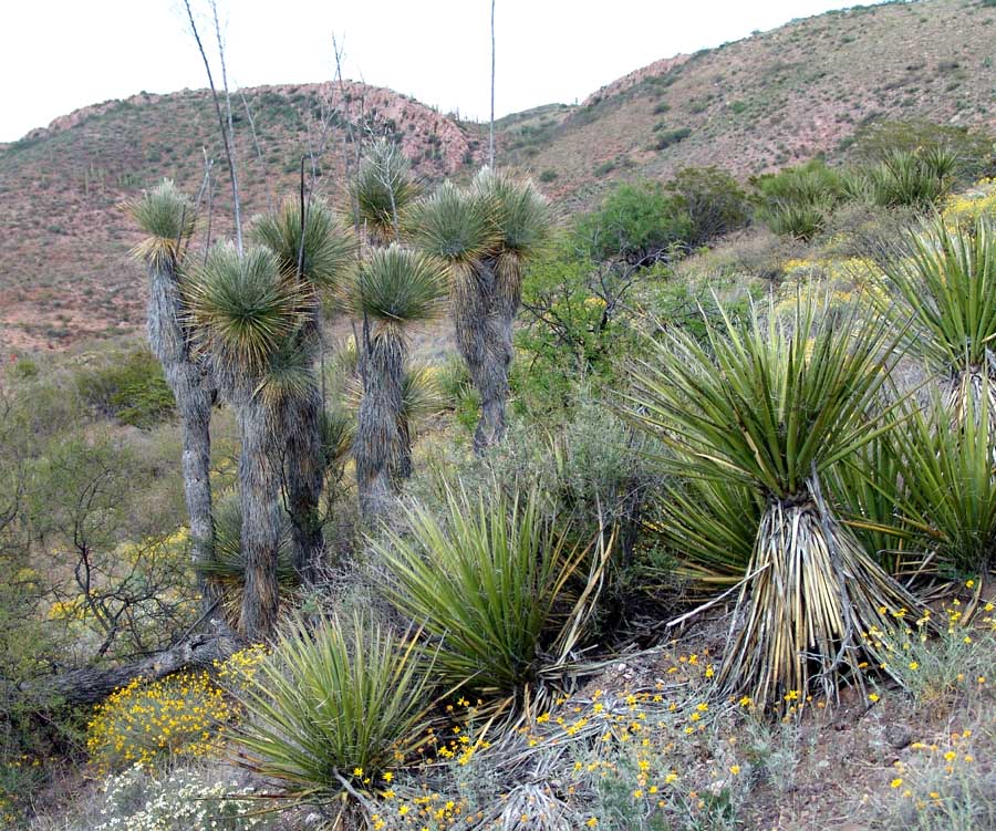 Sotol grows mainly on rocky hillsides between 3,000 to 6,000 feet, and is primarily a plant of the "Desert Grasslands" or "Apachean Savannah" rather than desert proper. In our area we see it mainly on north-facing slopes or (as above left) along washes.