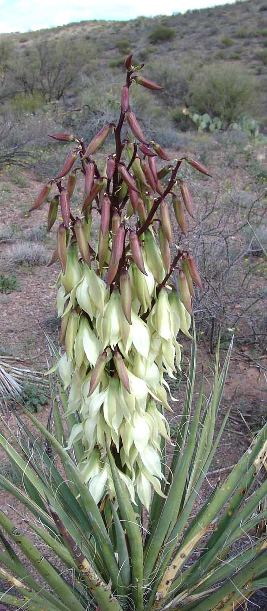 This yucca blooms from April to June, and will bloom many times in its lifetime, depending on rainfall. Below left: a blossom in May of 2003. Below right: April 2004, flowers opening along Pool Wash Ridge Road: (Click on each image to enlarge it)