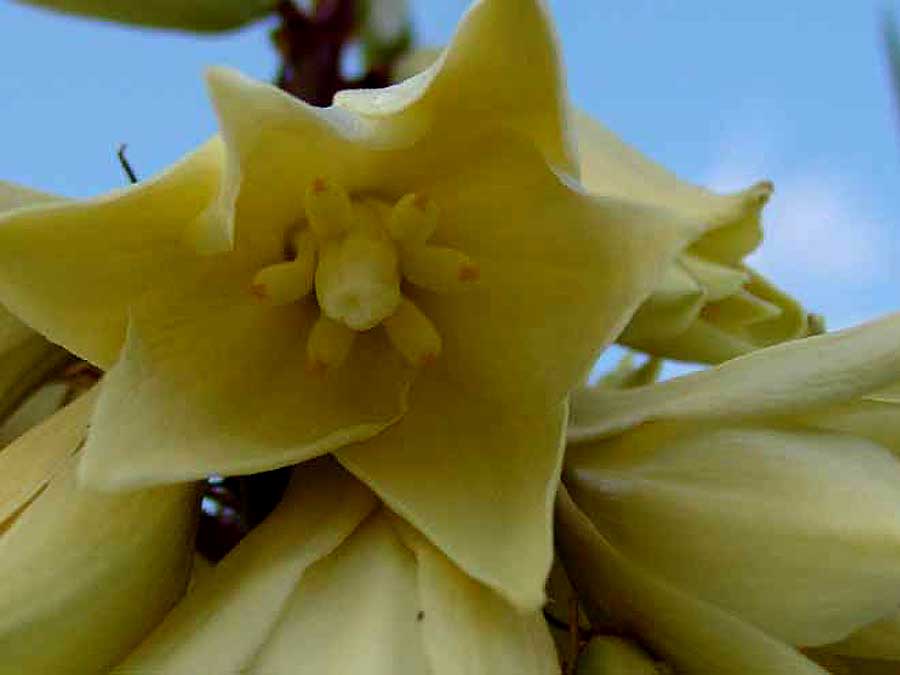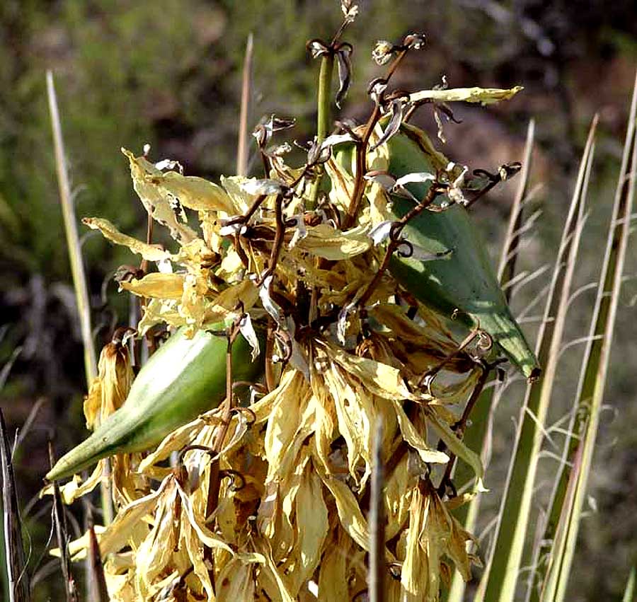 Compared with agaves, Yuccas have thinner, straighter, less succulent leaves, and many of them grow substantial trunks. Also unlike agaves, most of them bloom multiple times, and their flowers are distinctive -- large, bell-shaped, and white. The two species native to our area are