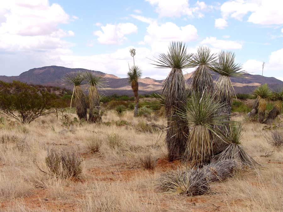 The image below, taken northeast of S-J Hill in October 2002, shows a clustered fellowship of Soaptree Yuccas at left-central, with their long stems (often branched), and the remains of tall flower stalks. At lower right in the photo is a stand of Y. baccata. Above this elevation in these uplands, we see only the latter.