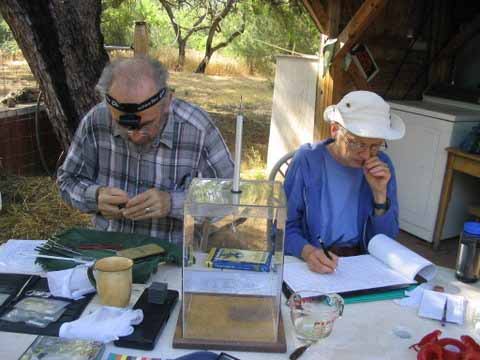 Below: at left, Liz and Bill Liz Taylor working at the SABO banding table at Skeen's and Abbotts, May 22, 2005; at right, Bill holds an adult male Black-chinned Hummingbird.