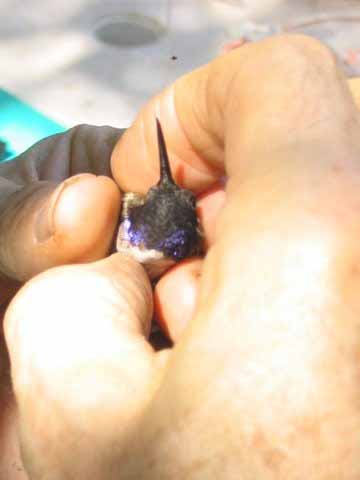 More oddities--a female Black-chin with the large head of a Camponotus sp. worker ant firmly attached just above the toes of her left leg yet under no apparent distress. The ant's head had evidently been there for some time: the flesh of her leg had grown over the pincers! Again, a male Black-chin had returned from the previous year with an ugly, suppurating sore mid-point on his bill. The previous year he had been noted with a smooth lump at the same site. The fun one, though, was the Black-chin male transporting 3 little yellow flower mites in his nostrils. (Of these we were successful in making a short movie clip through our field microscope.) Flower mites are harmless to hummers and may even signal to them the flower is drying out -- or dying -- as they leave the flower for a ride to fresher blossoms.